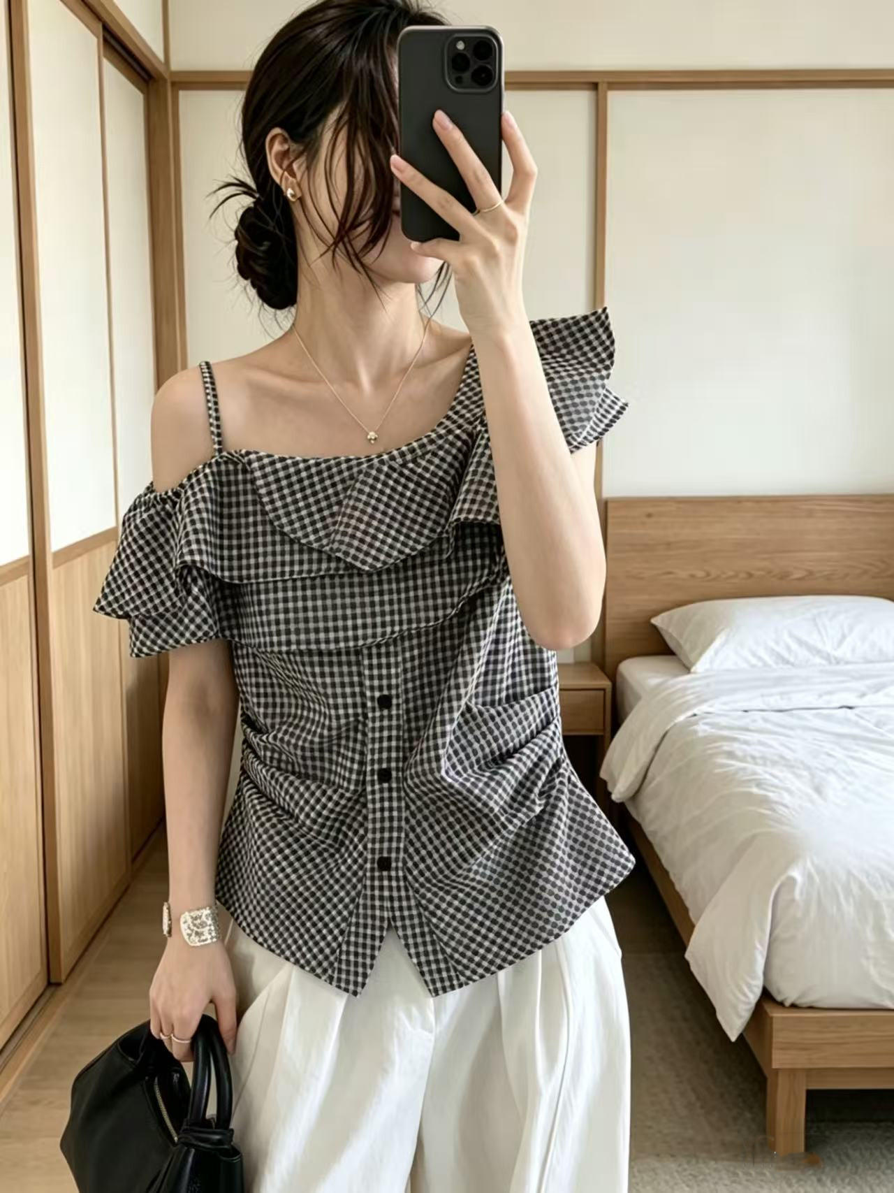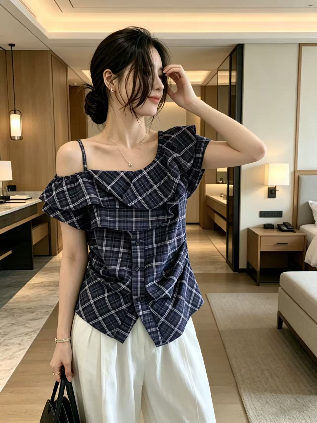 BY18557# 大码吊带衬衫女设计感小众不规则收腰短款小衫 服裝批發女裝批發服飾貨源