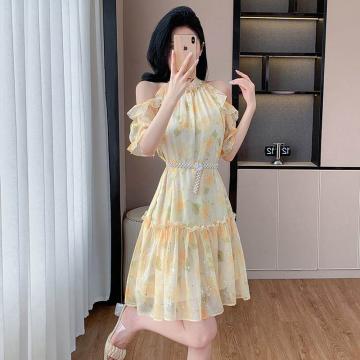 BY18564# 法式挂脖露肩温柔连衣裙小个子度假风沙滩多巴胺海边碎花裙 服裝批發女裝批發服飾貨源