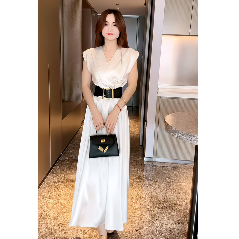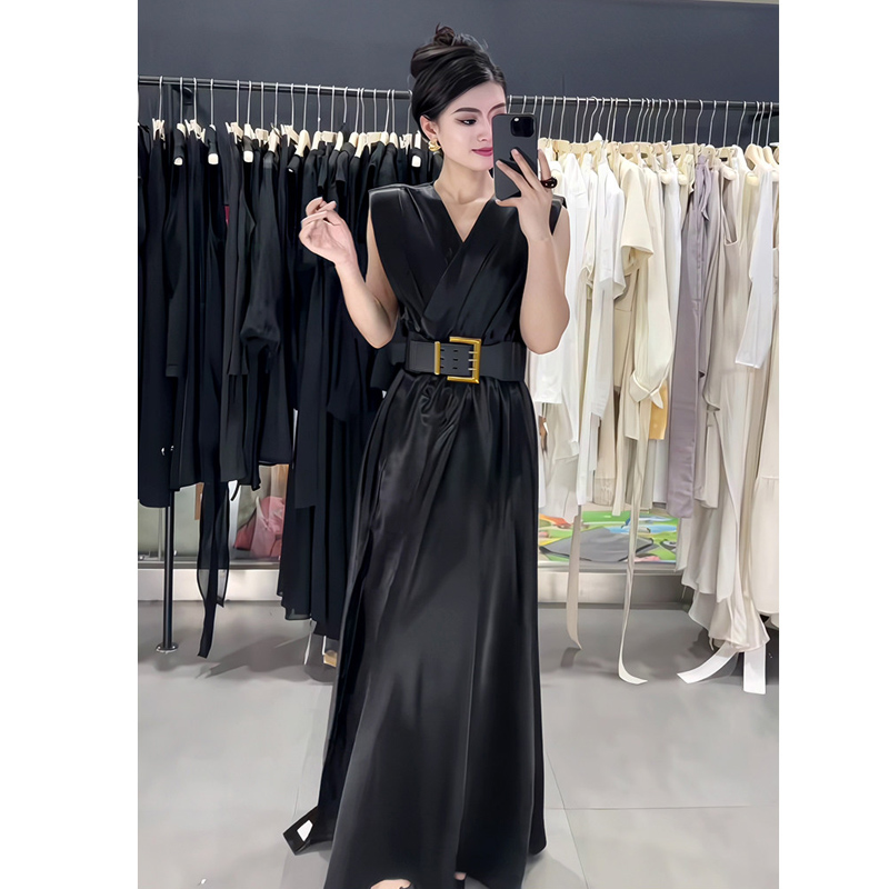 BY18566# 气质高级感坎肩V领收腰连衣裙女夏季新款高腰修身显瘦长裙子 服裝批發女裝批發服飾貨源