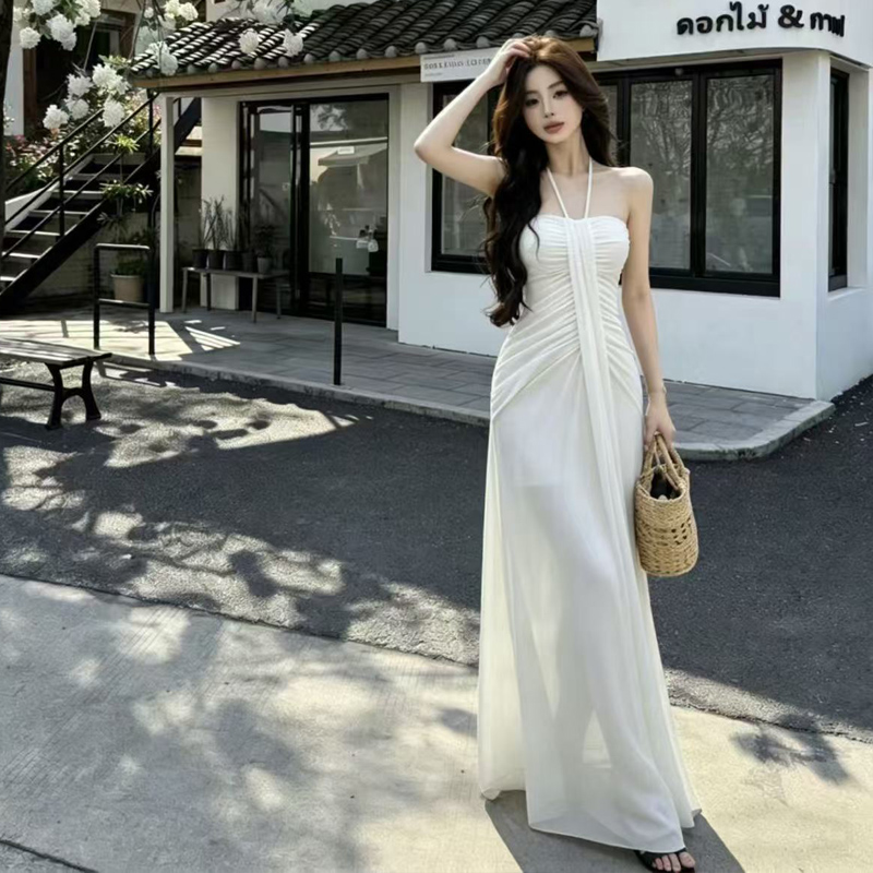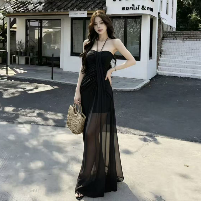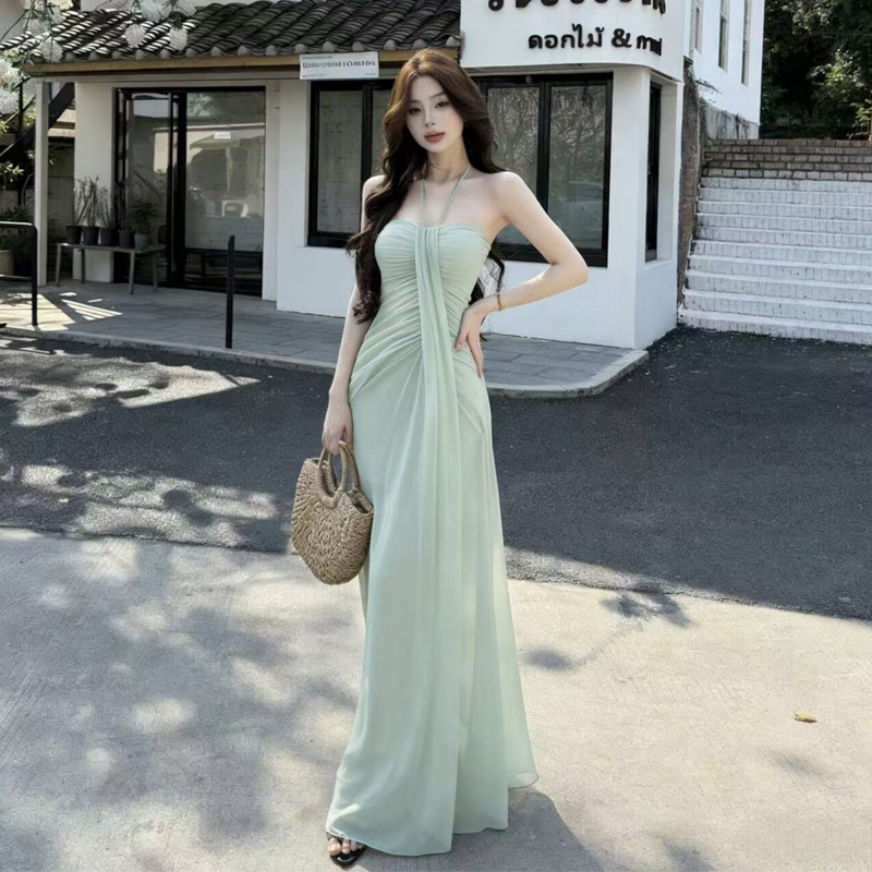 BY18568# 度假风挂脖抹胸网纱连衣裙女夏季新款绿色收腰显瘦气质长裙氛围感 服裝批發女裝批發服飾貨源
