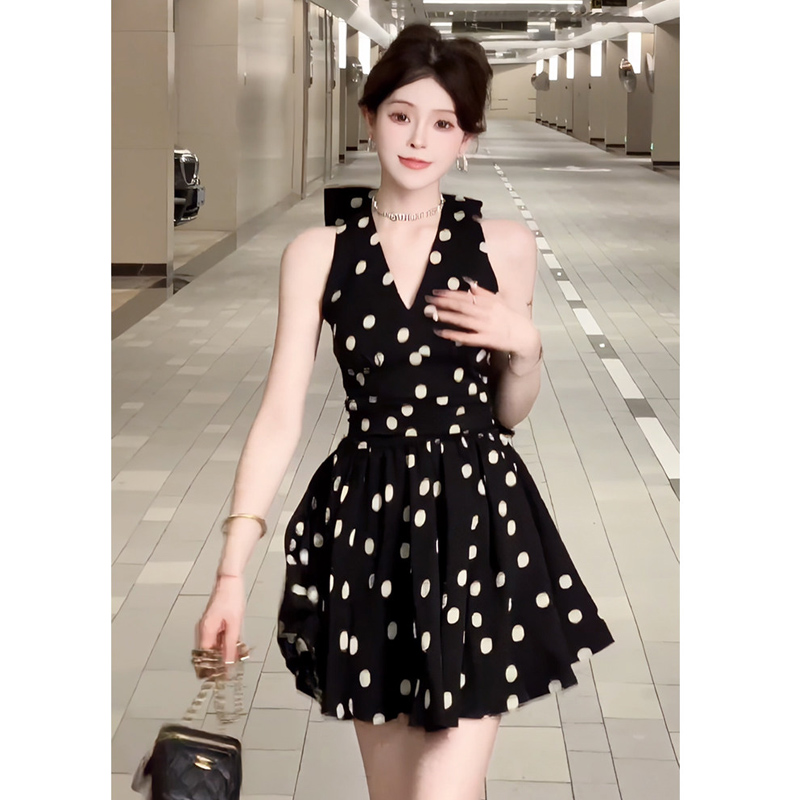 BY18571# 法式波点挂脖连衣裙女夏辣妹带胸垫收腰a字短裙绝美蝴蝶结仙女裙 服裝批發女裝批發服飾貨源