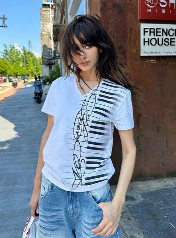 BY18576# 精棉复古琴键印花V领正肩短袖T恤女夏季新款辣妹修身显瘦白色上衣 服裝批發女裝批發服飾貨源