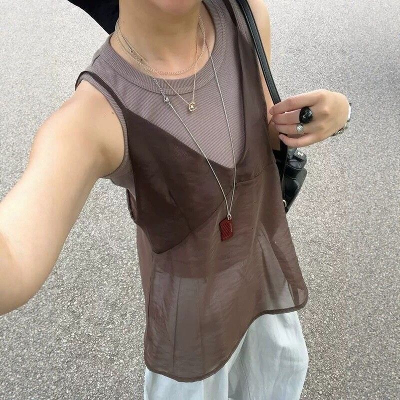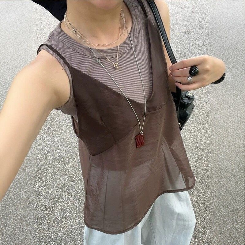 BY18580# 棕色吊带背心叠穿两件套装修身舒适日常休闲百搭潮流上衣夏季 服裝批發女裝批發服飾貨源