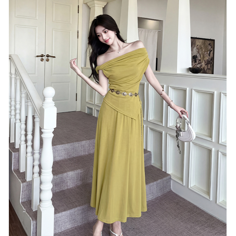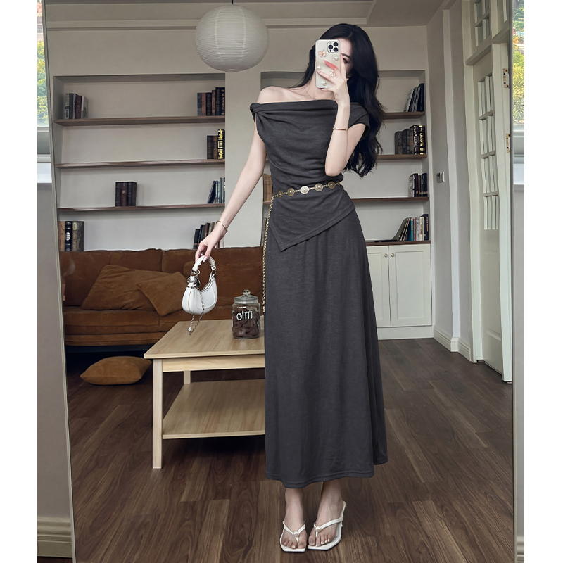 BY18939# 法式斜肩套装一字肩显瘦小个子女不规则下摆上衣T半身裙 服裝批發女裝批發服飾貨源