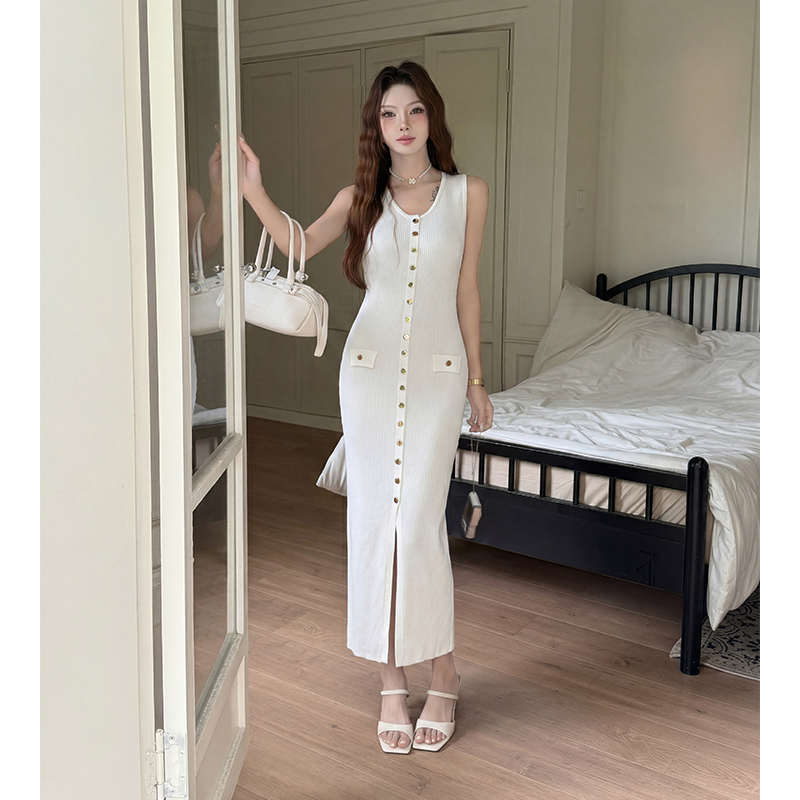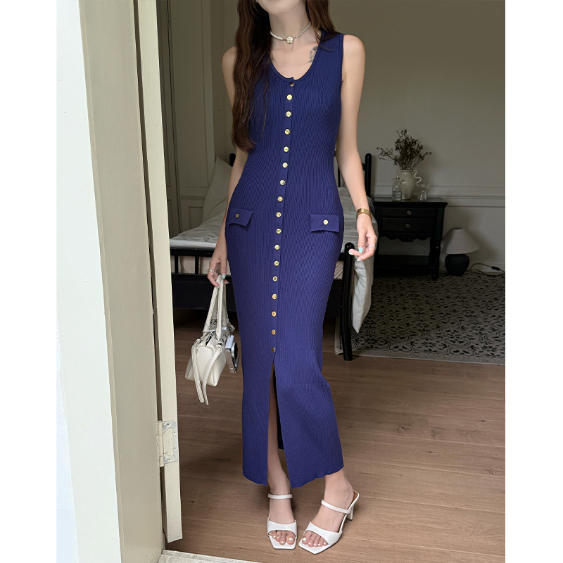 BY18941# 法式夏季圆领针织无袖排扣修身宴会长款连衣裙背心开叉裙 服裝批發女裝批發服飾貨源