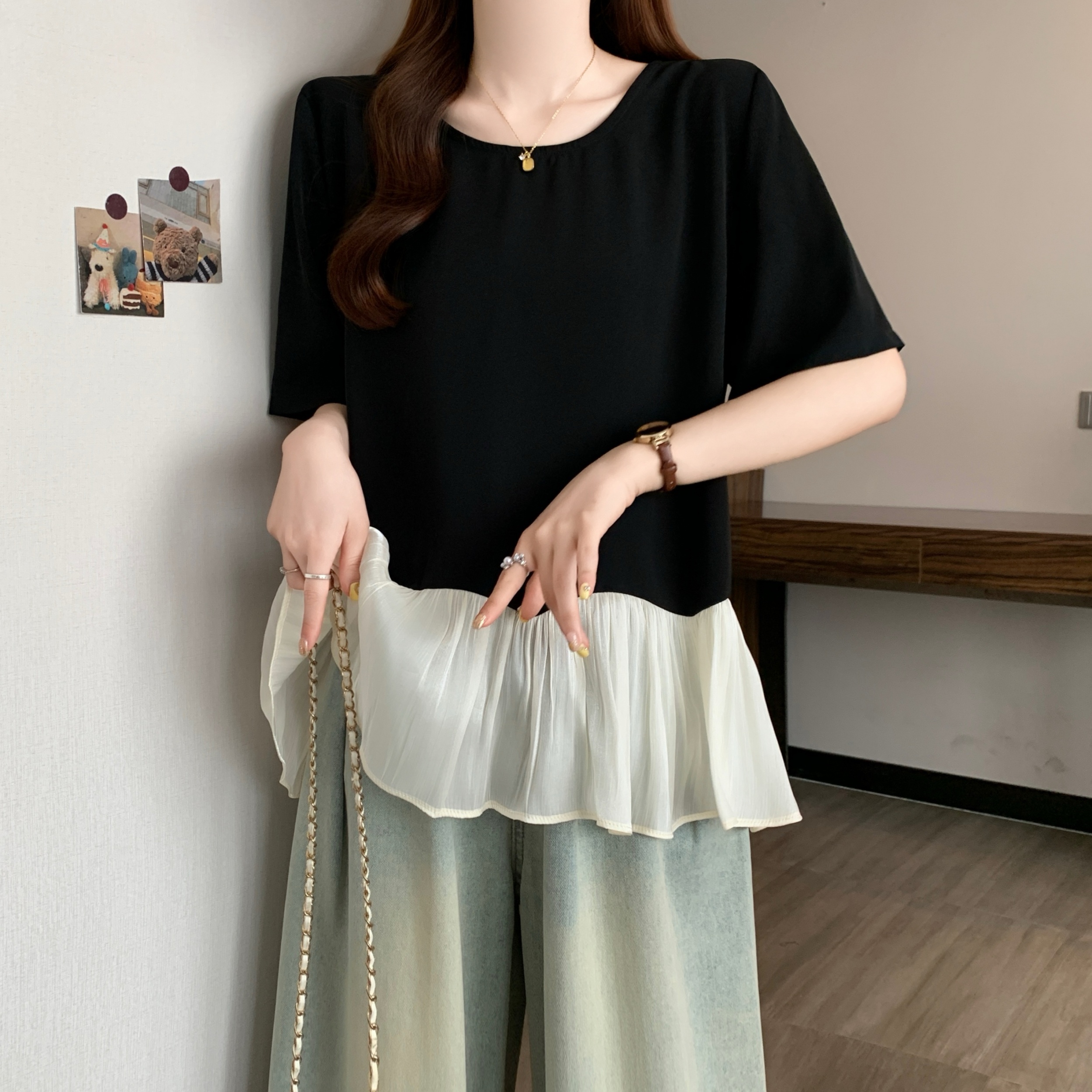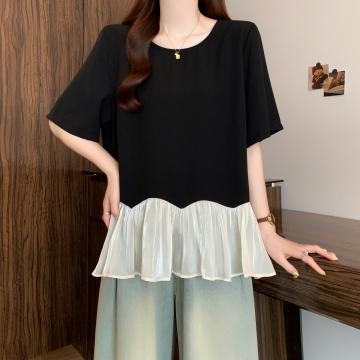 BY18948# 大码设计感荷叶下摆短袖t恤女夏季宽松遮肉显瘦别致小衫上衣 服裝批發女裝批發服飾貨源