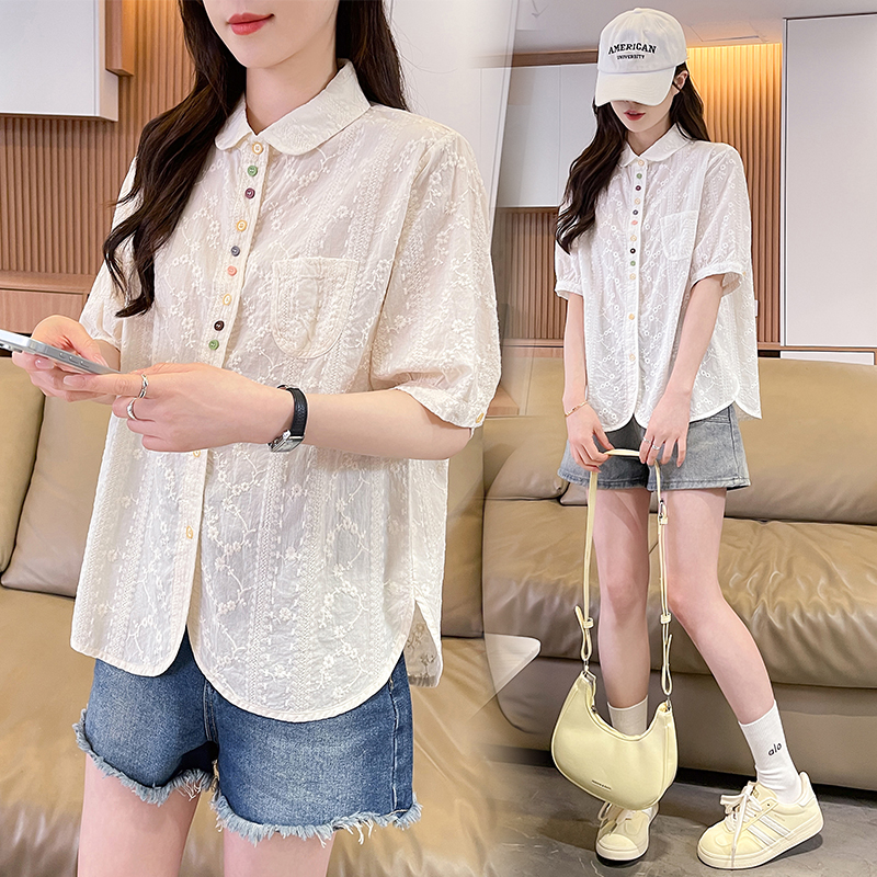 BY18958# 彩色纽扣纯棉白色短袖衬衫女夏外穿小个子新款设计感薄款上衣 服裝批發女裝批發服飾貨源