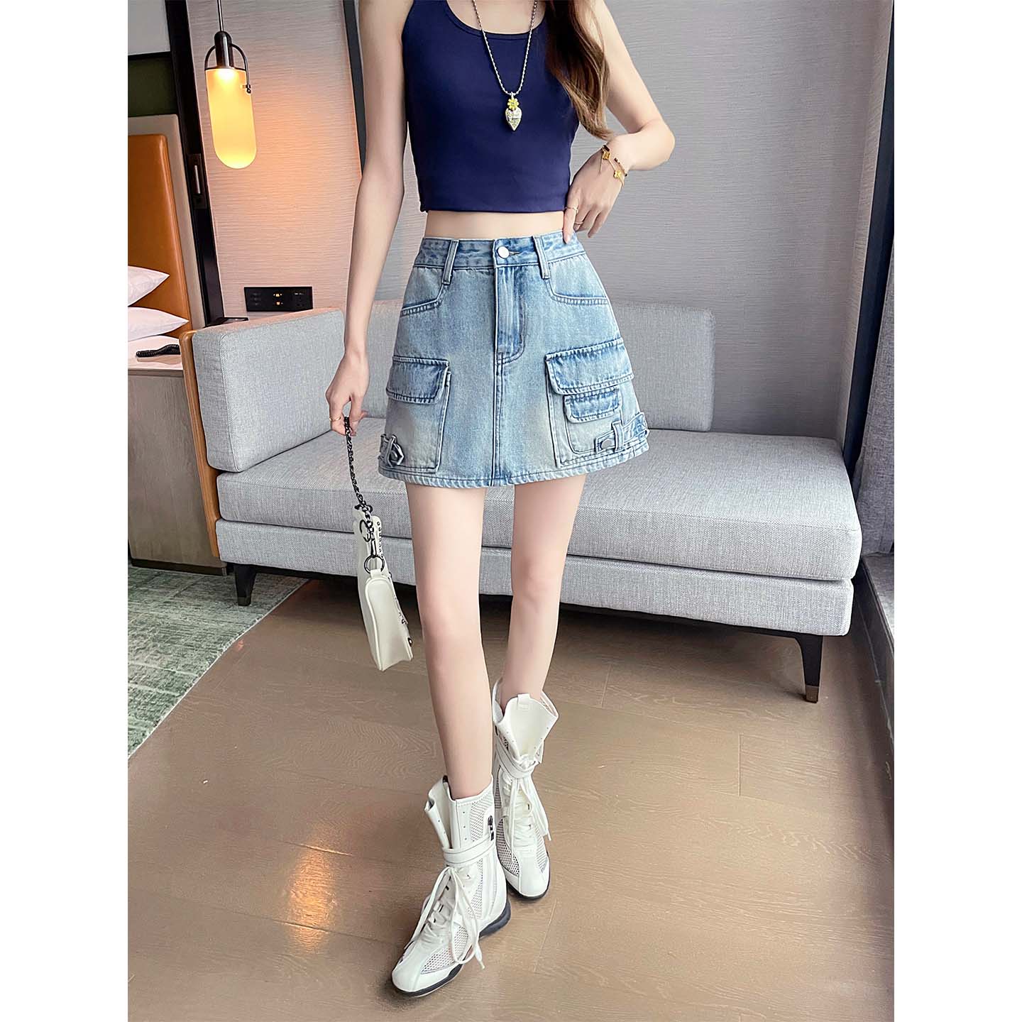 BY18966# 牛仔半身裙女夏季薄款多口袋工装裙辣妹a字显瘦包臀短裙 服裝批發女裝批發服飾貨源
