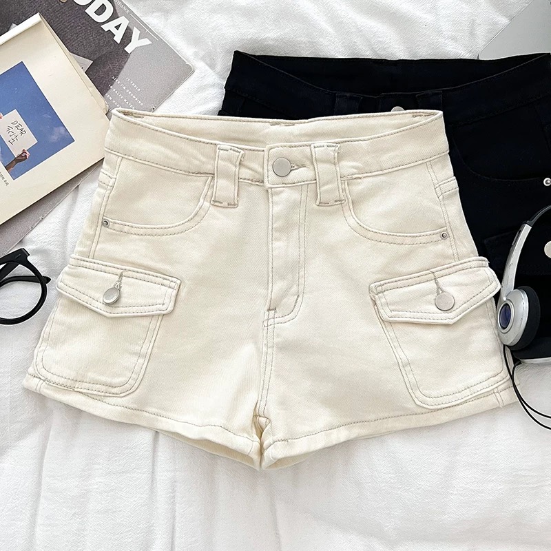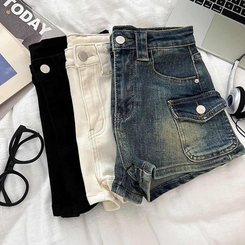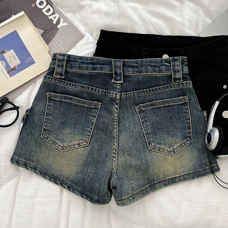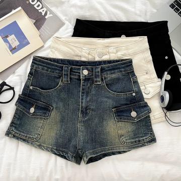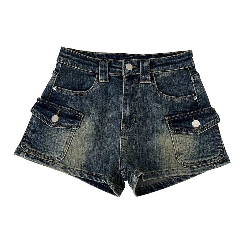 BY18974# 美式复古辣妹时尚百搭高腰显瘦牛仔双口袋短裤热裤阔腿裤休闲裤女 服裝批發女裝批發服飾貨源