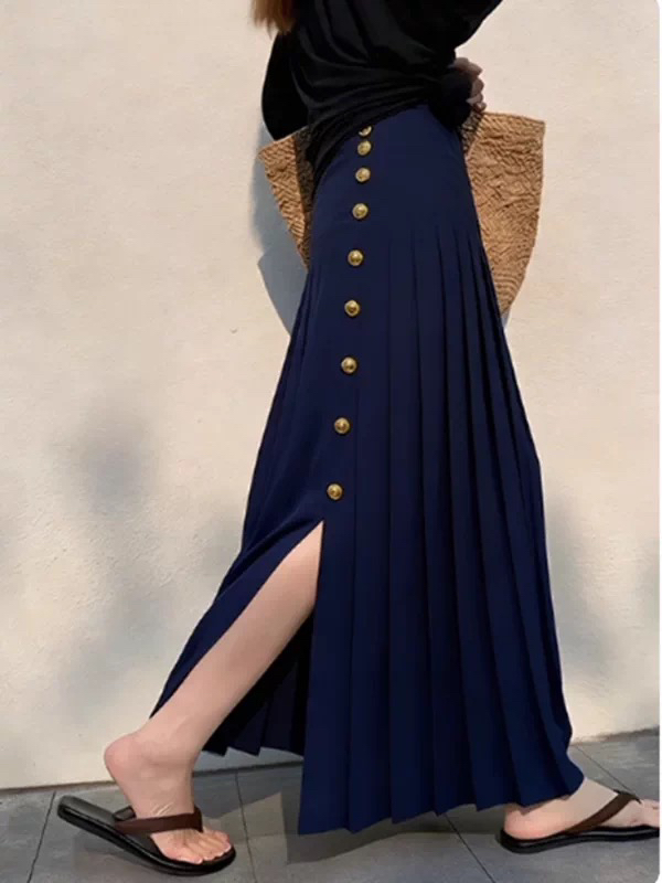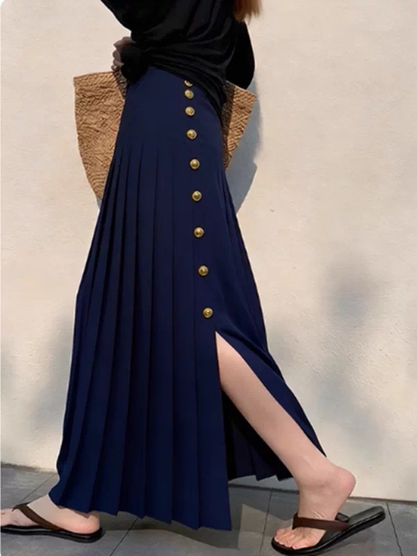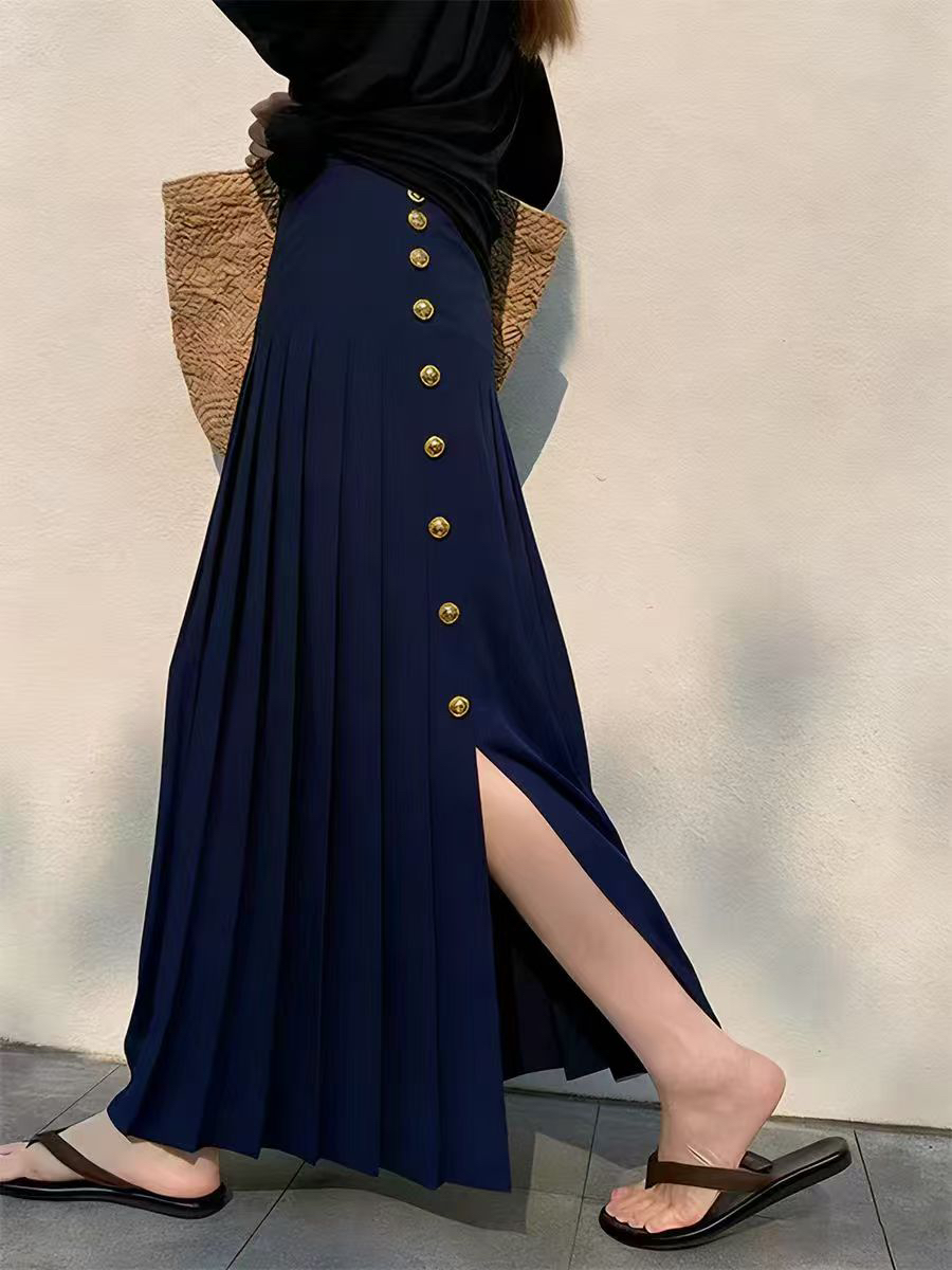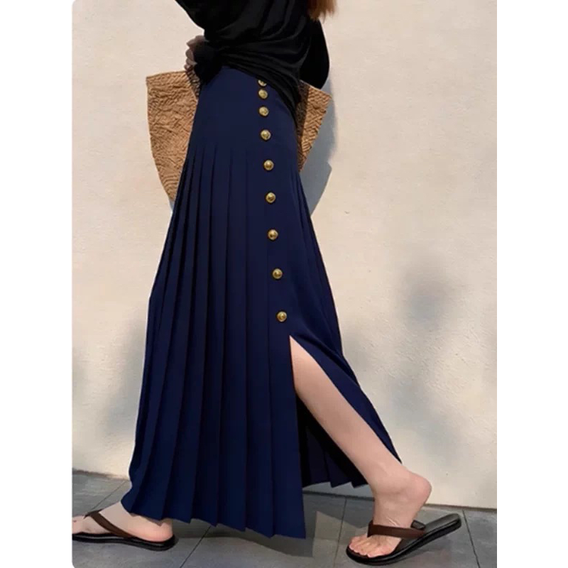 BY18983# 重要场合漂亮裙子高腰气质高腰藏青色单排扣百褶开叉半身裙女早秋 服裝批發女裝批發服飾貨源