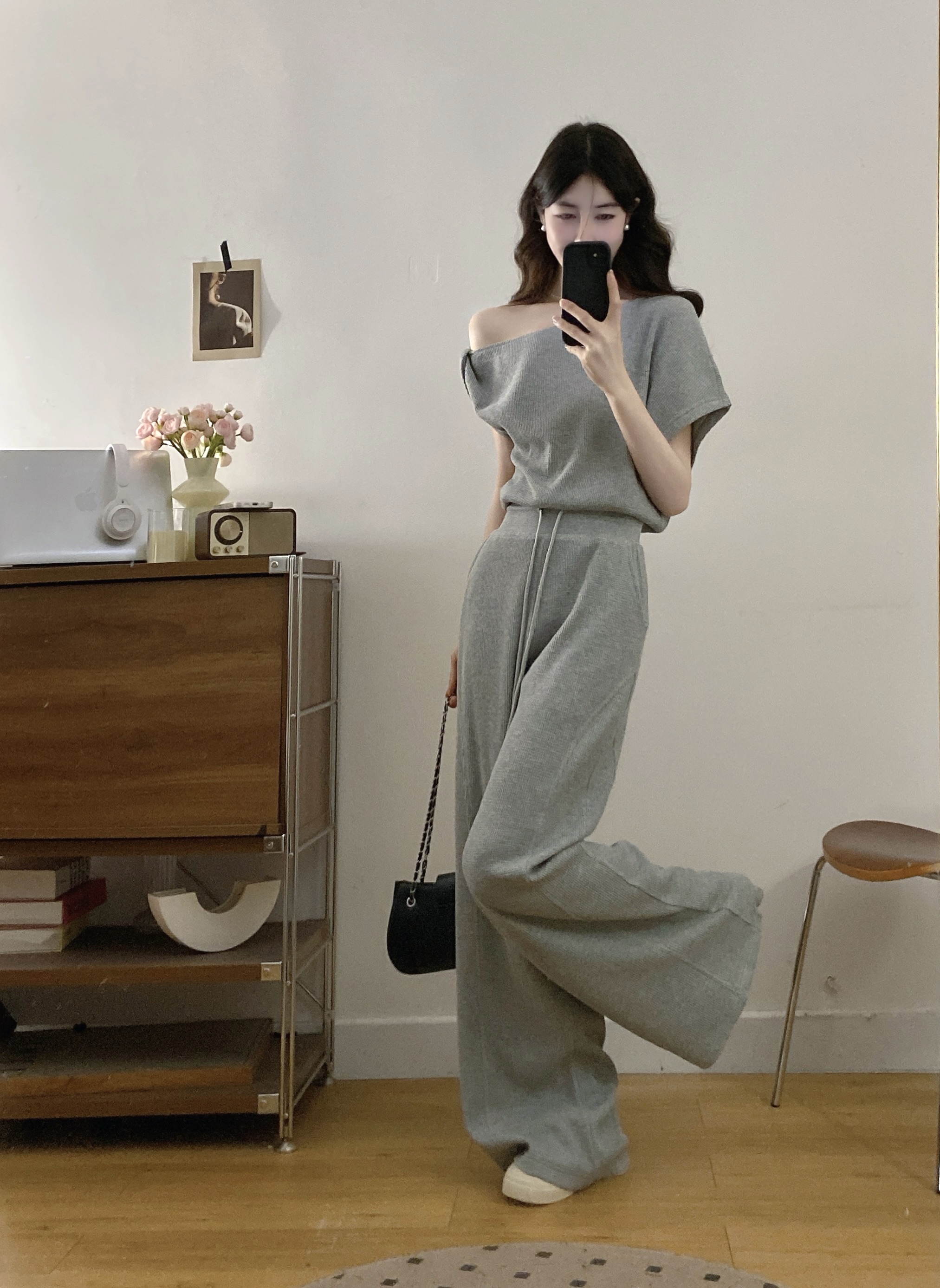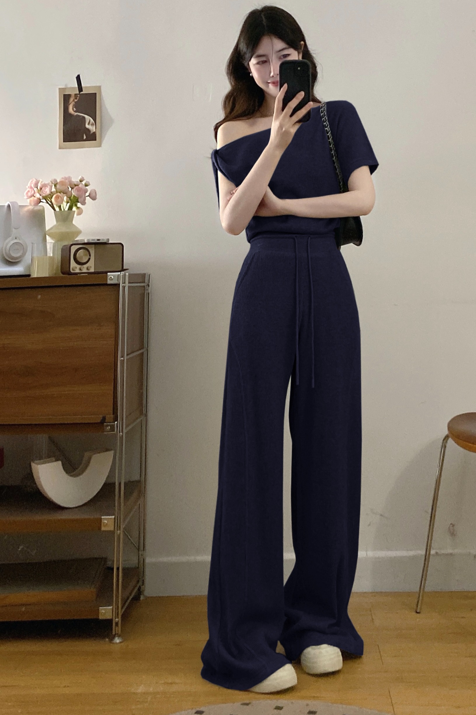 BY19001# 斜领露肩短袖T恤女宽松直筒休闲阔腿裤套装夏 服裝批發女裝批發服飾貨源