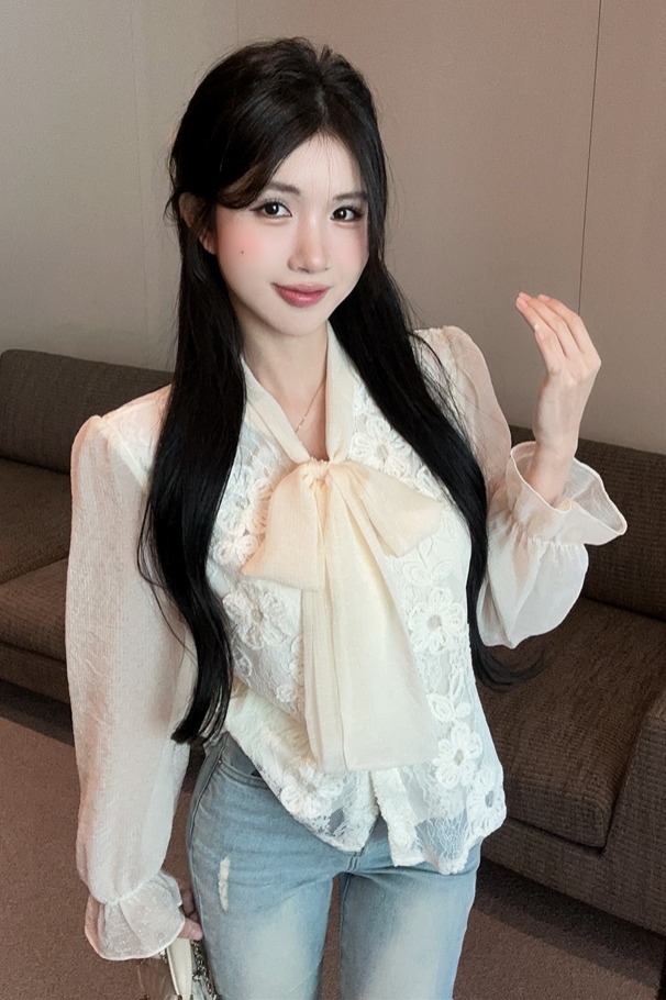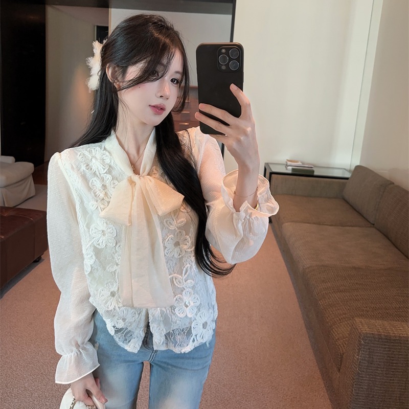 FA52124# 春秋法式蝴蝶结拼接印花泡泡袖衬衫设计感宽松单排扣开衫衬衣 服裝批發女裝批發服飾貨源