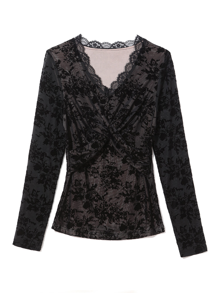 新款洋气百搭V领蕾丝拼接黑色植绒网纱长袖打底衫 服裝批發女裝批發服飾貨源