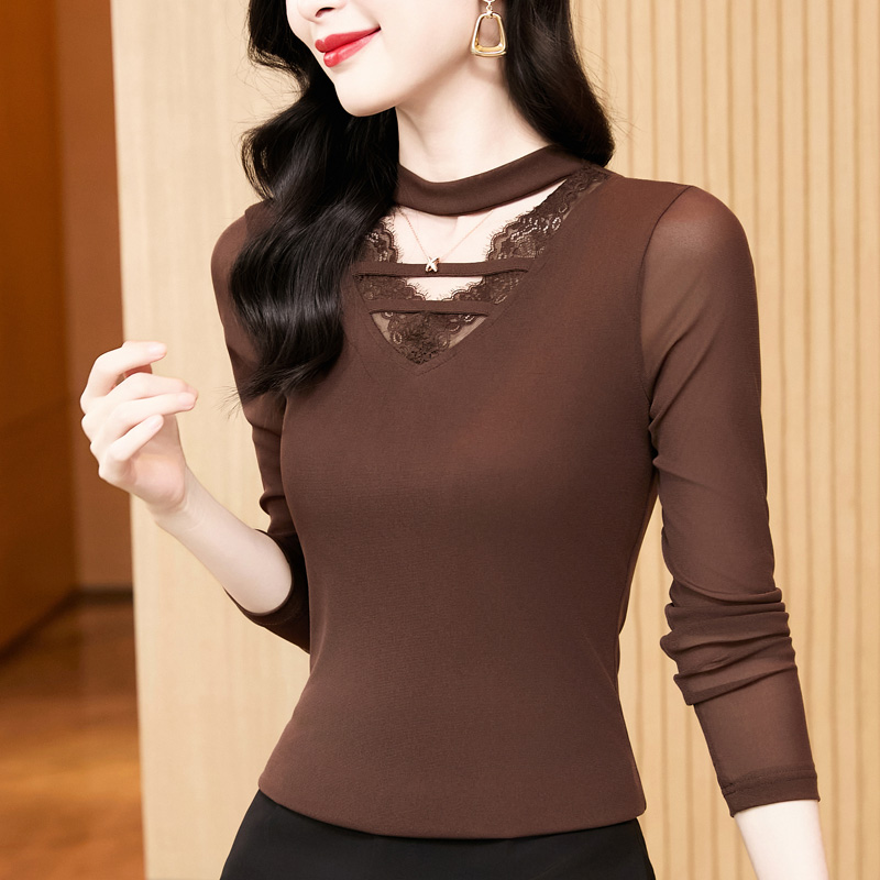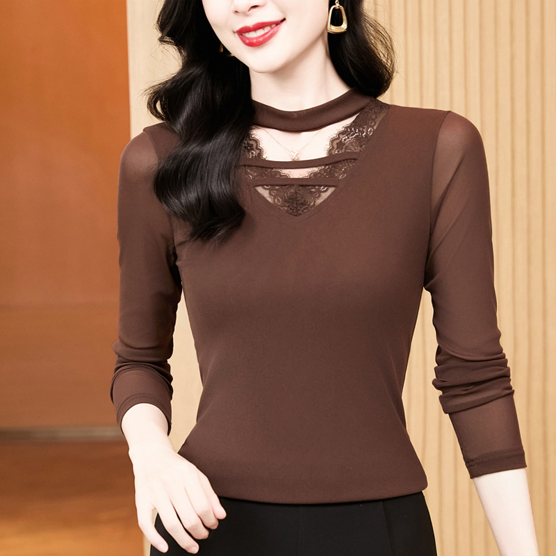FA52175# 新款洋气百搭V领蕾丝拼接纯色长袖网纱打底衫女 服裝批發女裝批發服飾貨源