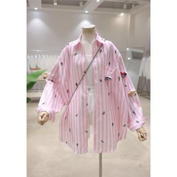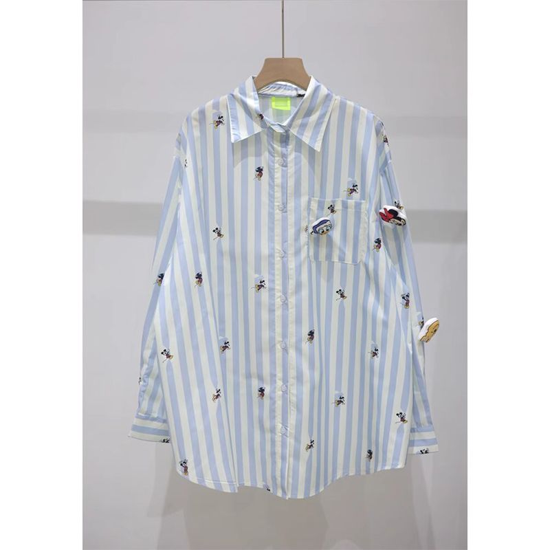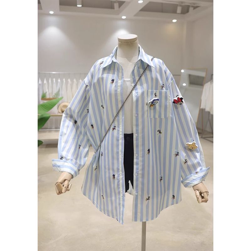 FA53650# 外贸原版韩国东大门时尚气质条纹刺绣立体卡通衬衫女薄款防晒潮