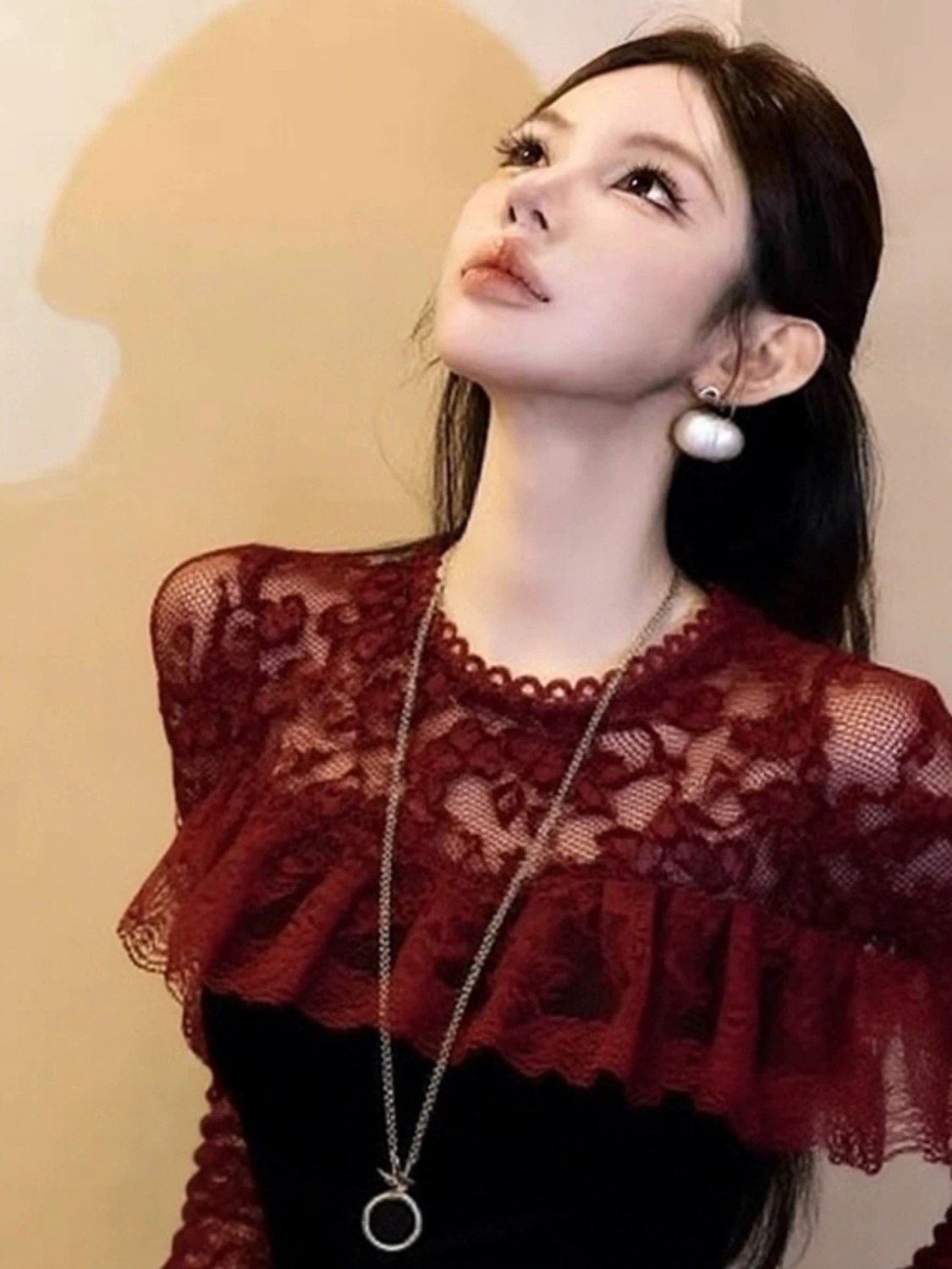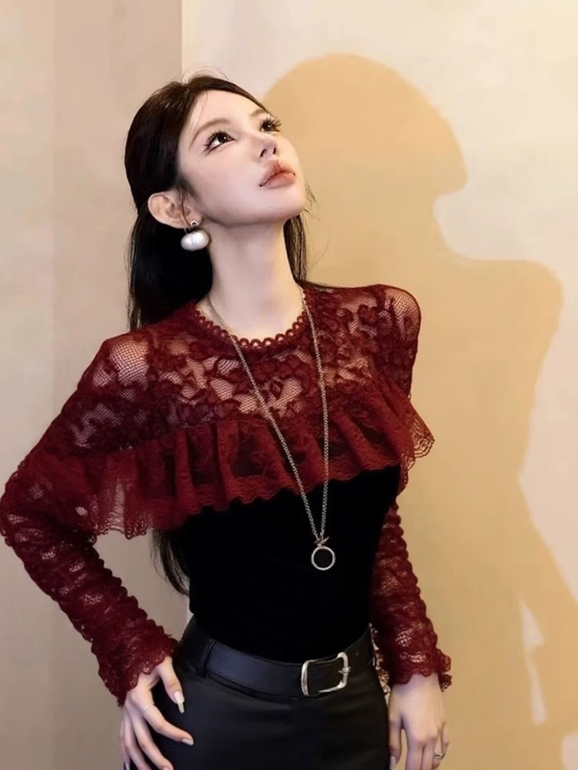 FA53654# 酒红色蕾丝拼接上衣冬季爆款绝美巨好看气质名媛内搭叠穿衬衫