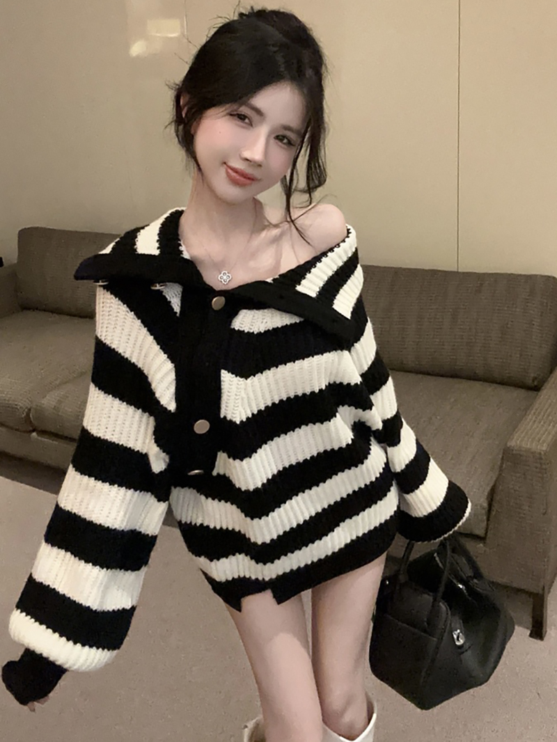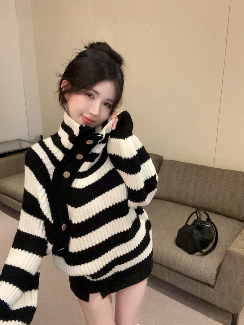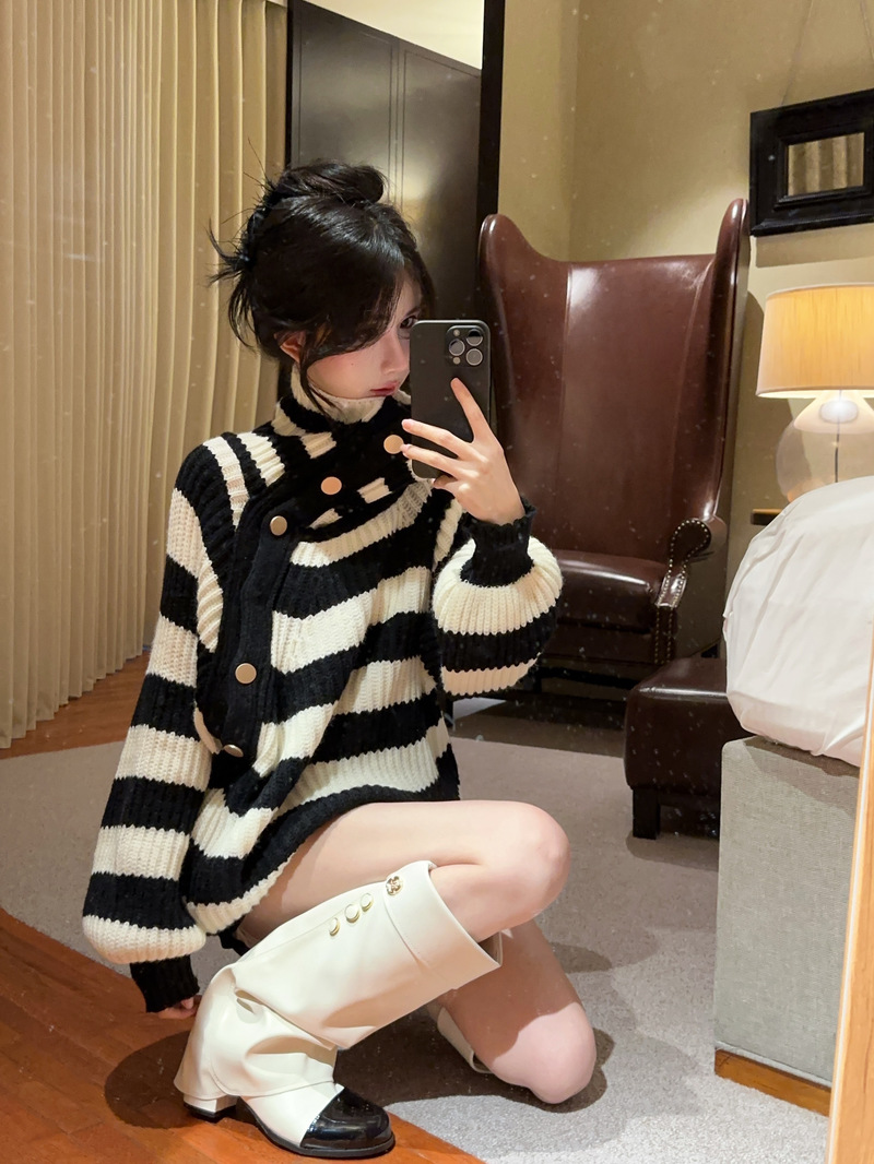 FA53662# 设计感条纹高领毛衣一字领慵懒毛衣上衣女