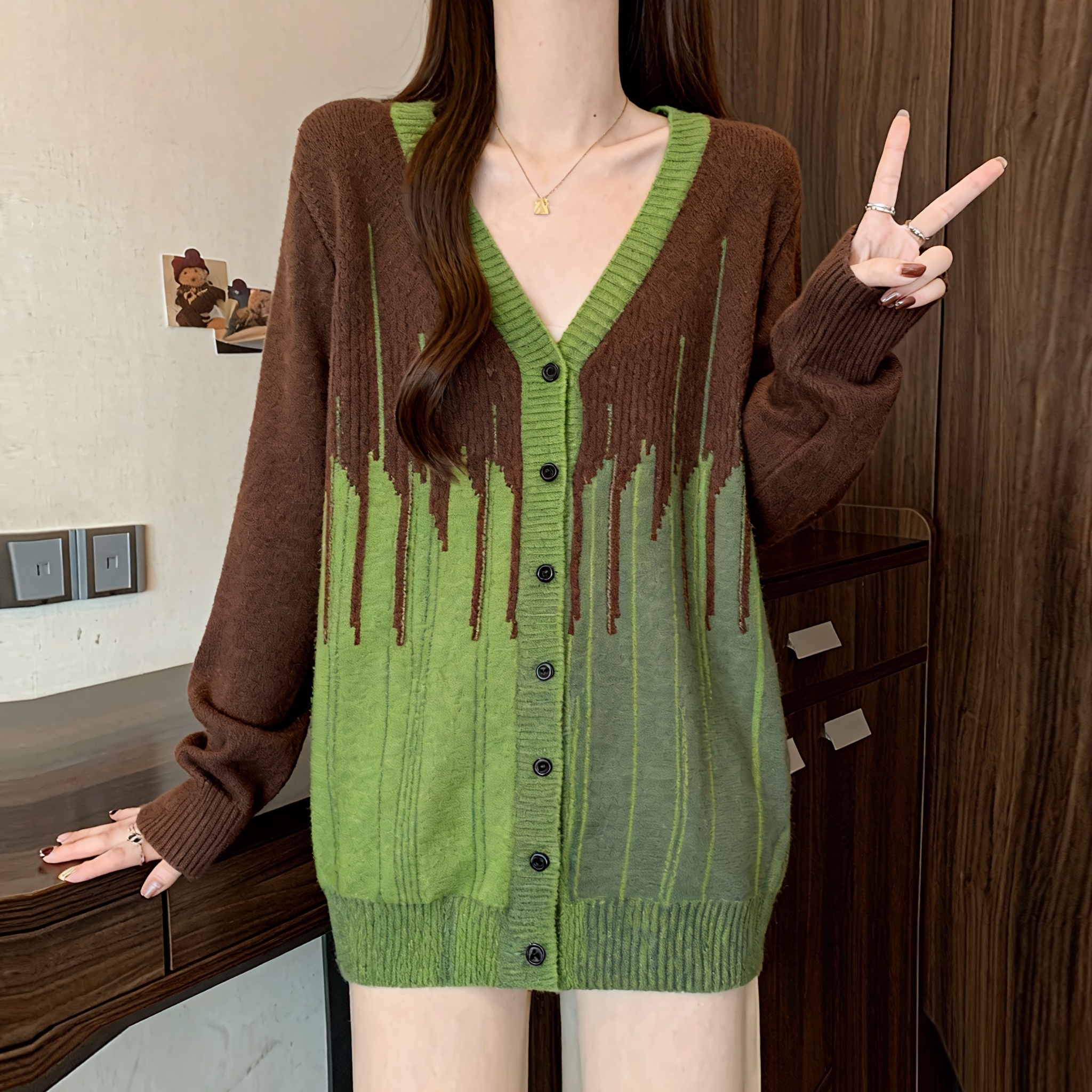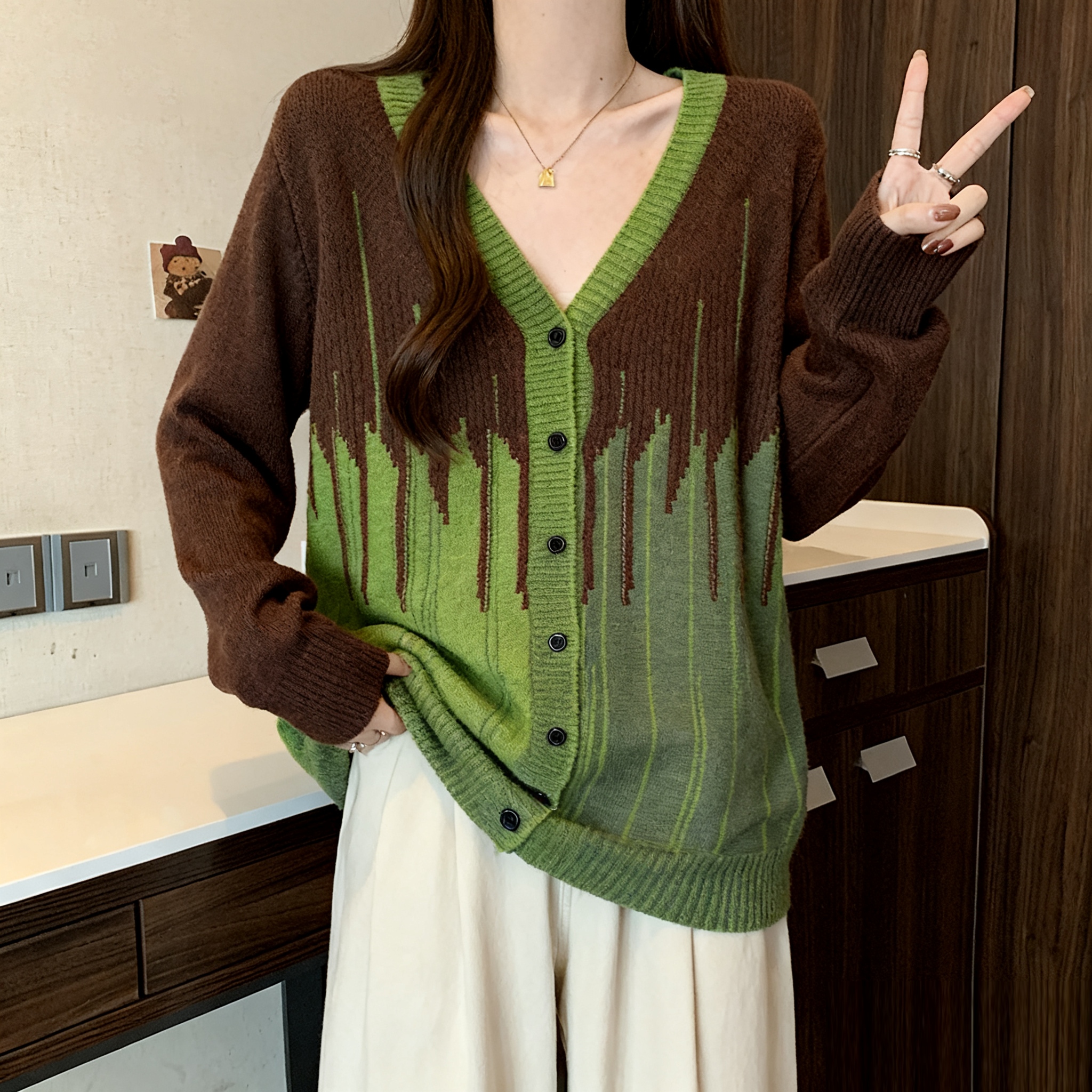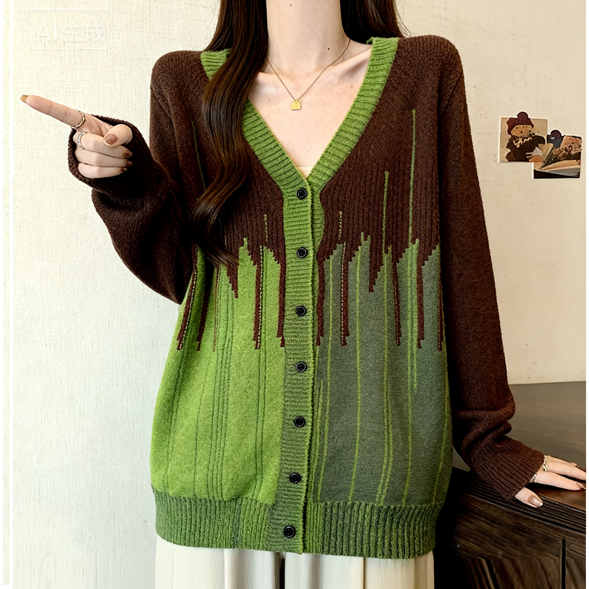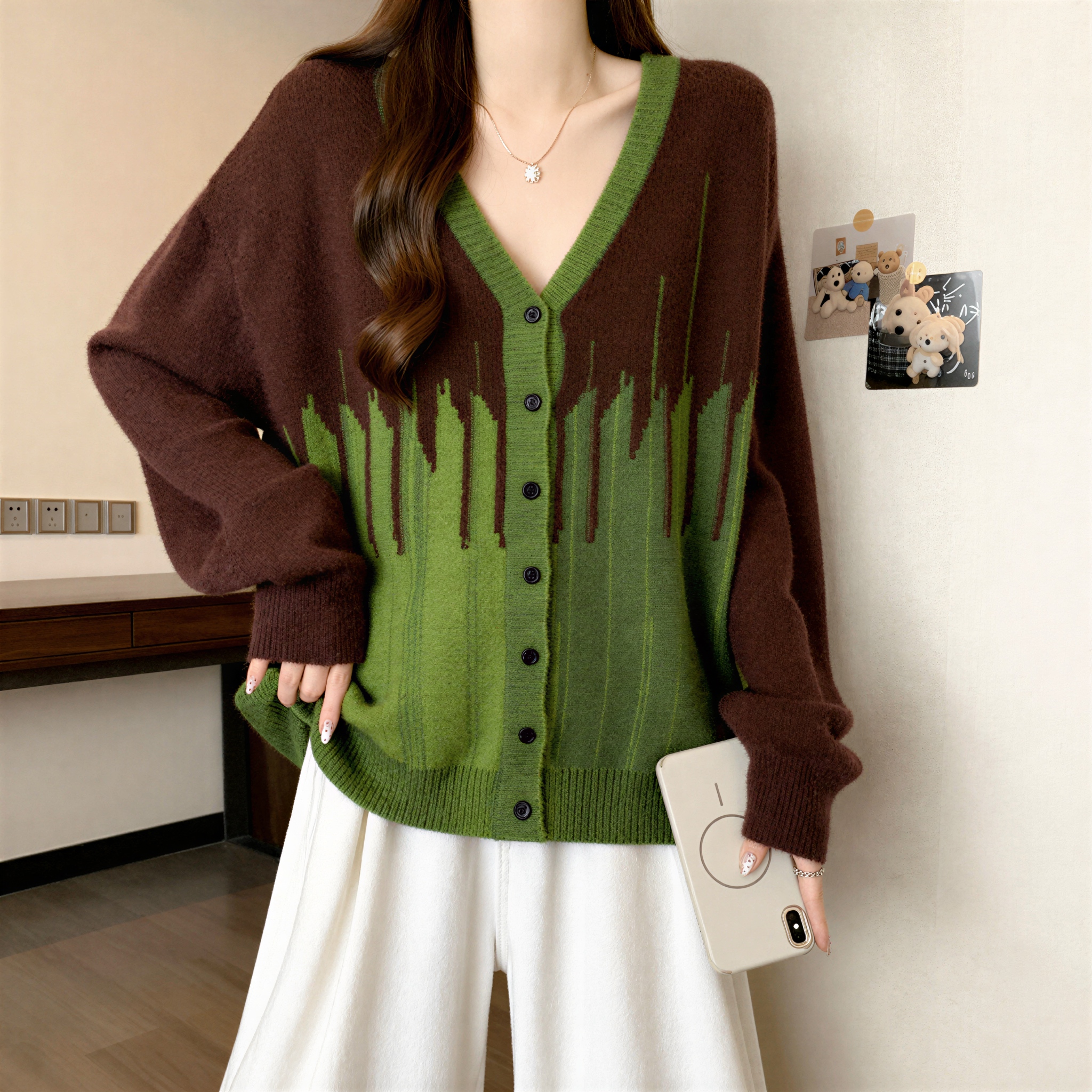FA53686# 时髦撞色V领长袖针织开衫外套女秋季大码胖MM高级百搭显瘦上衣潮