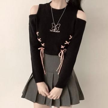 FA53691# 韩国chic设计感露肩针织甜酷风修身辣妹短款小个子上衣