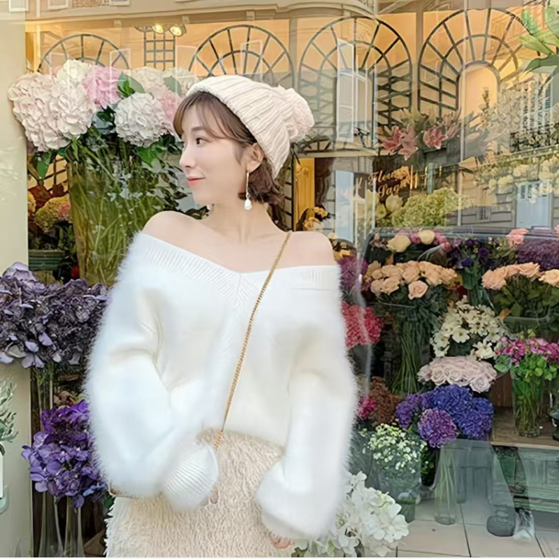 YF6940# (4色入内)慵懒风露肩泡泡袖抹胸海马毛宽松大码显瘦原宿风加厚针织上衣