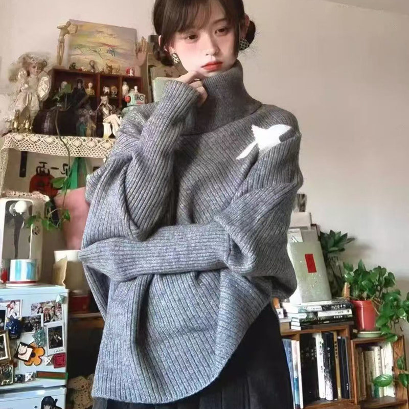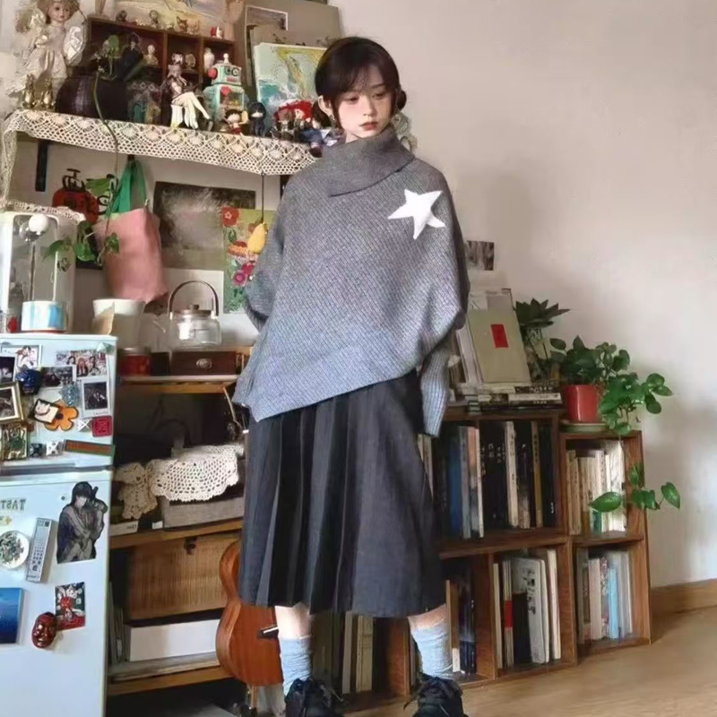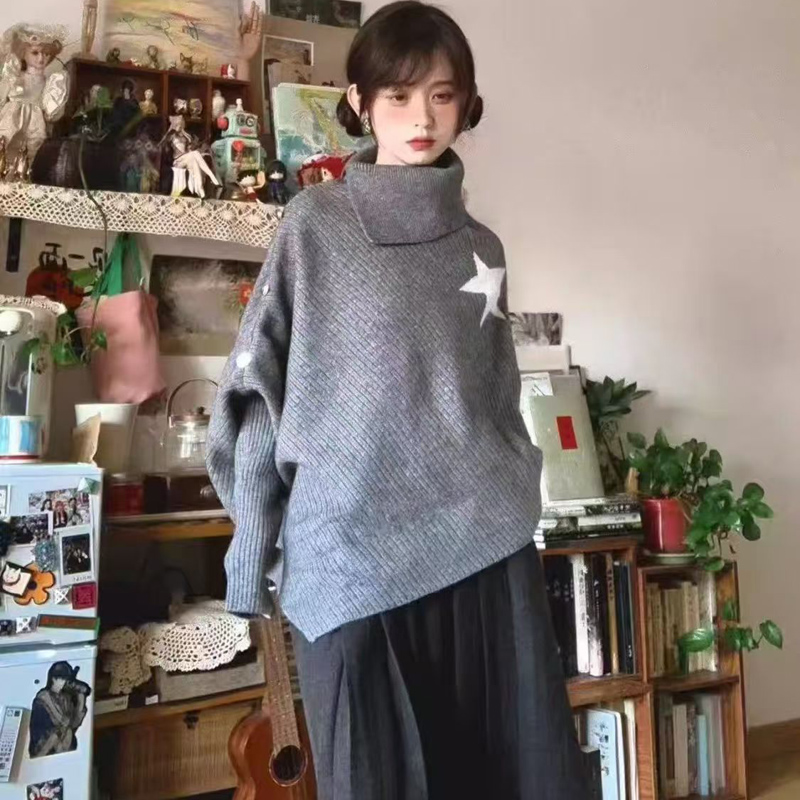 YF6967# 图片色时尚冬装不规则星星长袖高领宽松开叉显瘦蝙蝠袖针织毛衣