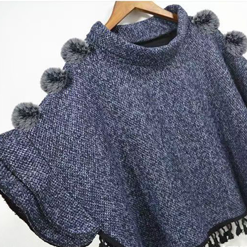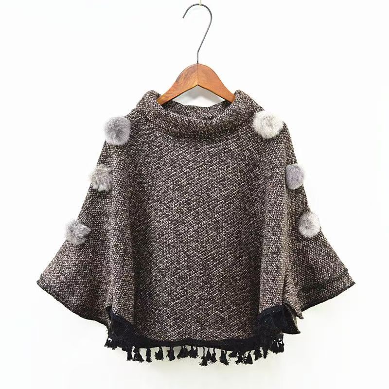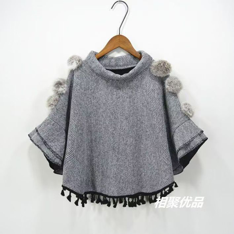 YF6995(4色入内)秋冬蝙蝠袖圆领毛毛球流苏设计感宽松显瘦休闲百搭斗篷披肩