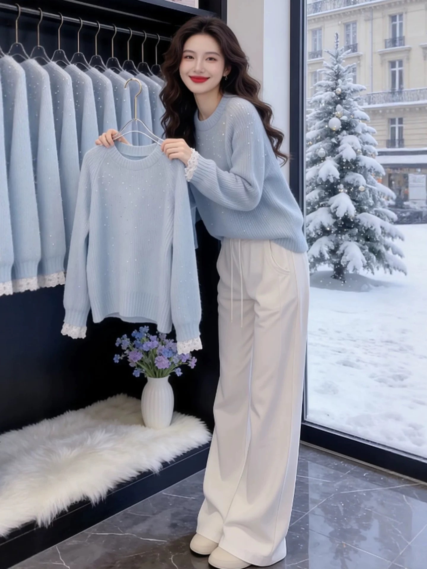 FA56788# 奶蓝色蕾丝拼接假两件碎钻亮丝毛针织衫春季慵懒高级感上衣女 服裝批發女裝批發服飾貨源