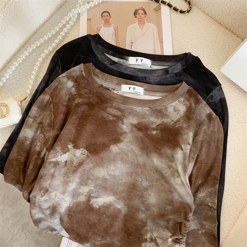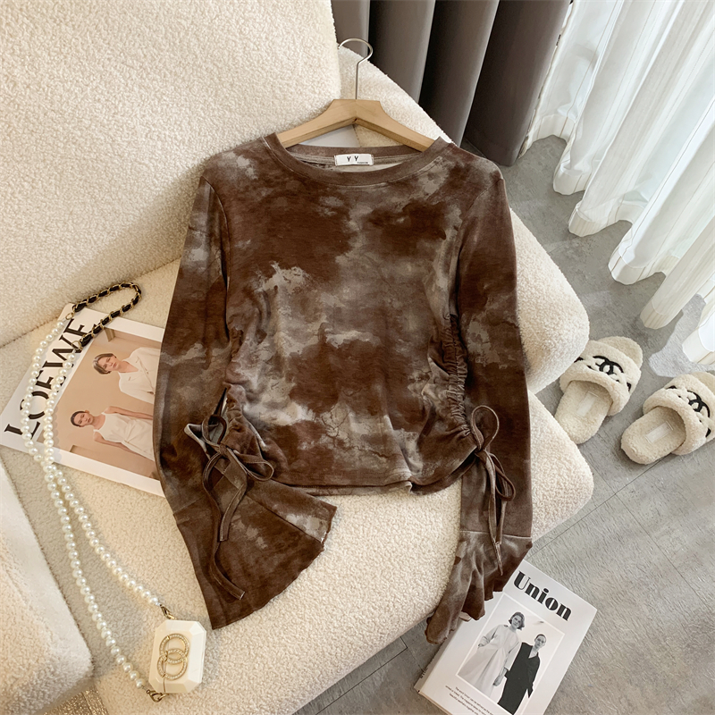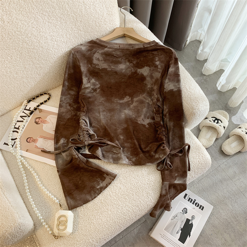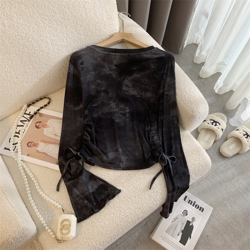 FA56799# 甜辣妹扎染抽绳喇叭袖上衣纯欲长袖T恤 服裝批發女裝批發服飾貨源