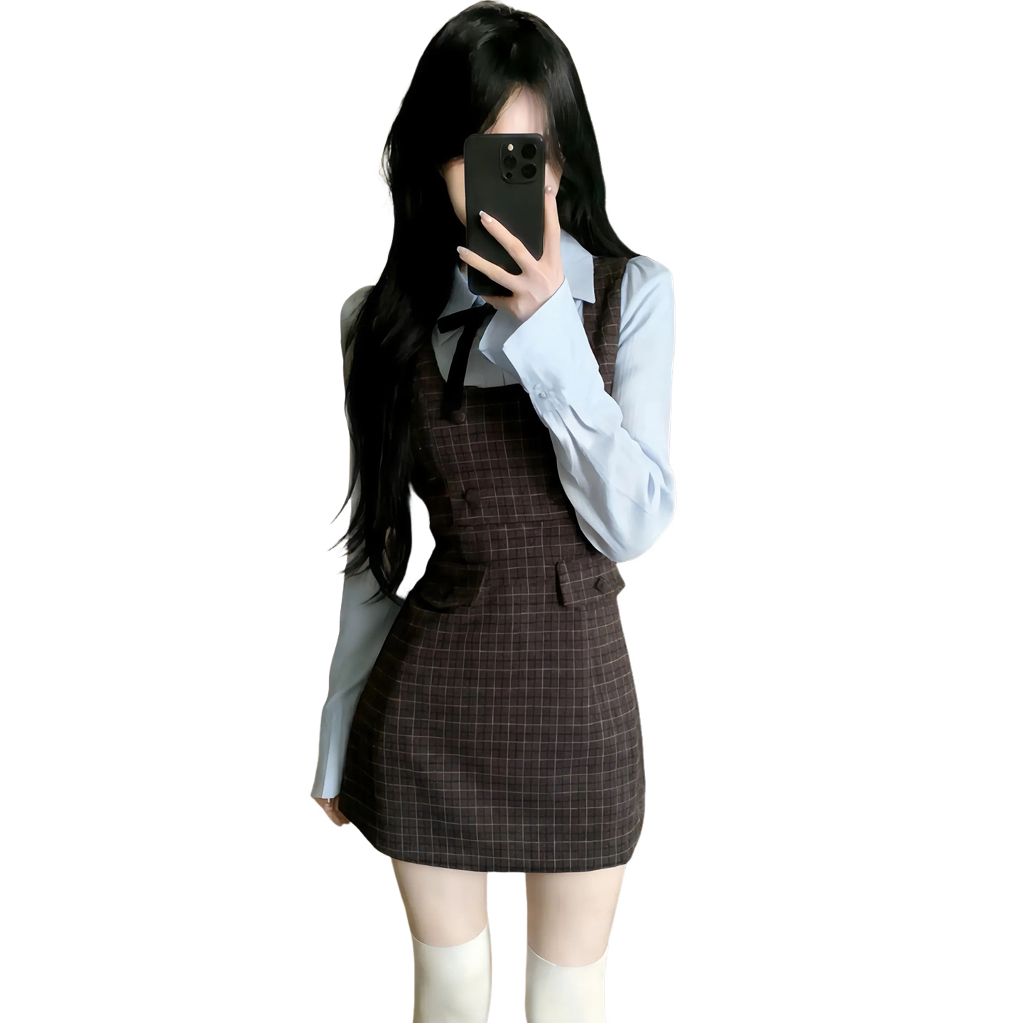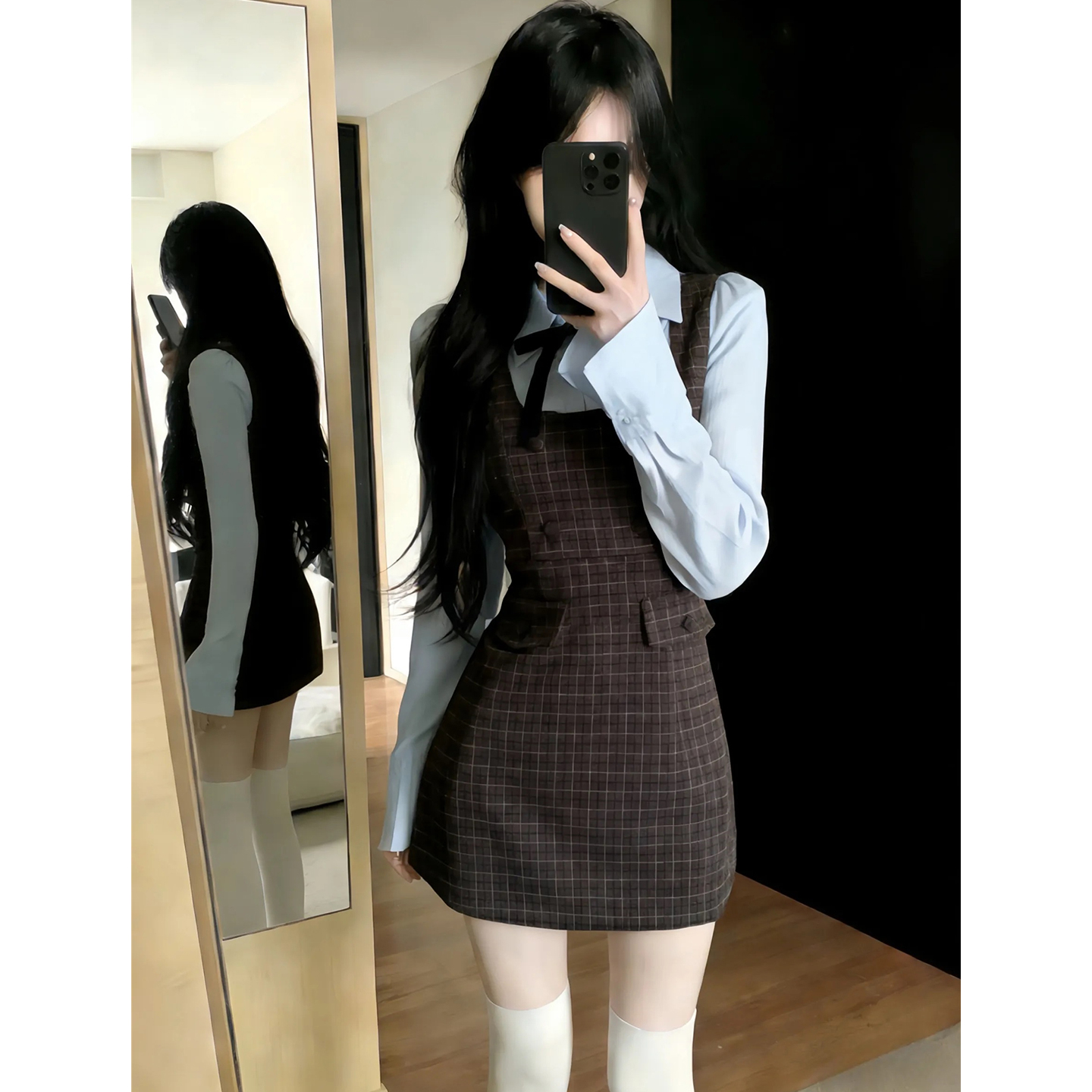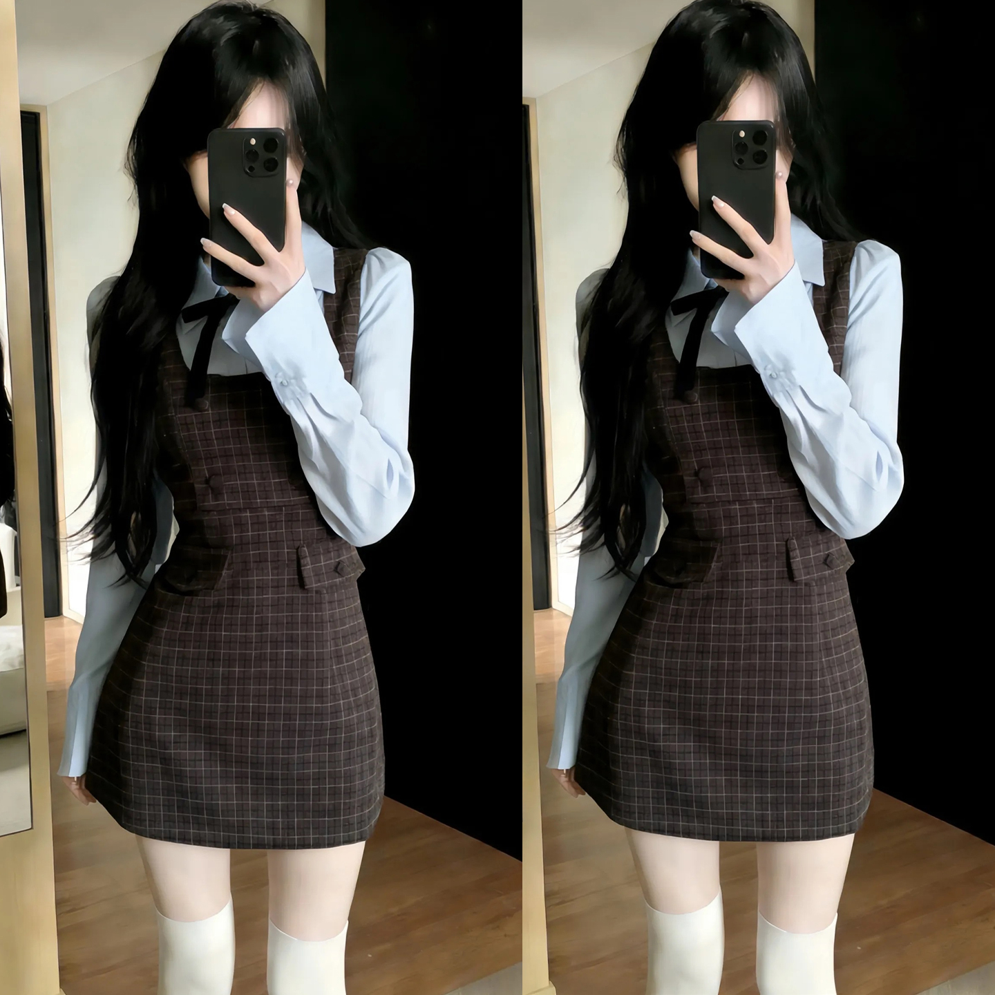 FA56812# 韩系学院风假两件长袖连衣裙女早春季新款高级感包臀格纹短裙 服裝批發女裝批發服飾貨源