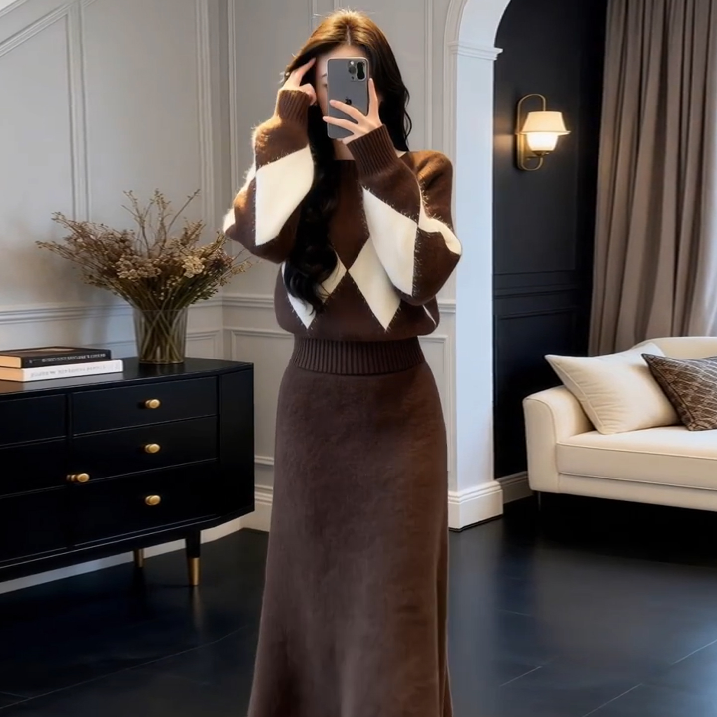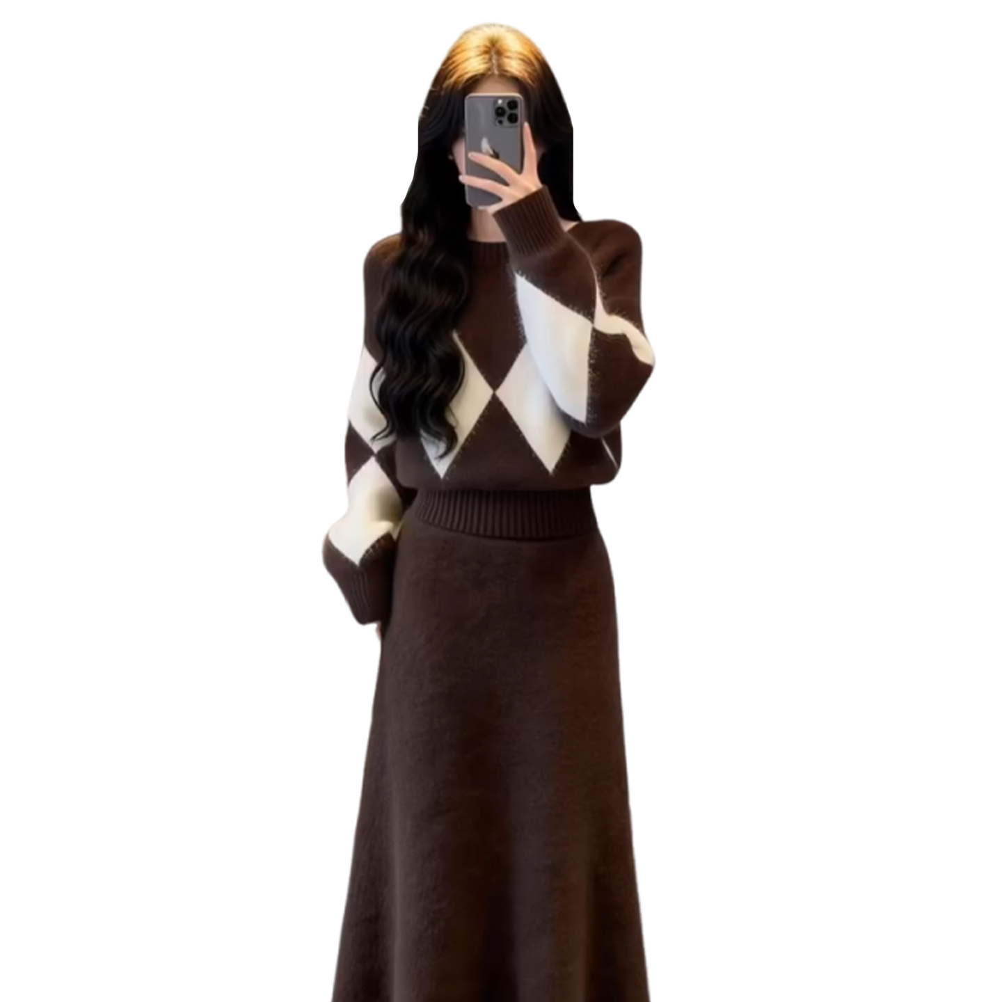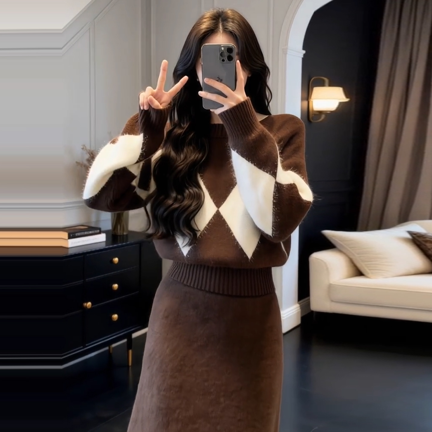 FA56813# 美拉德咖色针织毛衣连衣裙子女秋冬季新款穿搭一整套装高级感 服裝批發女裝批發服飾貨源