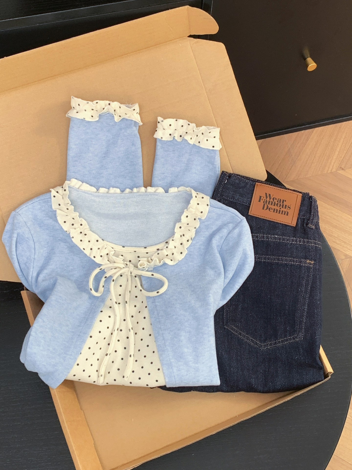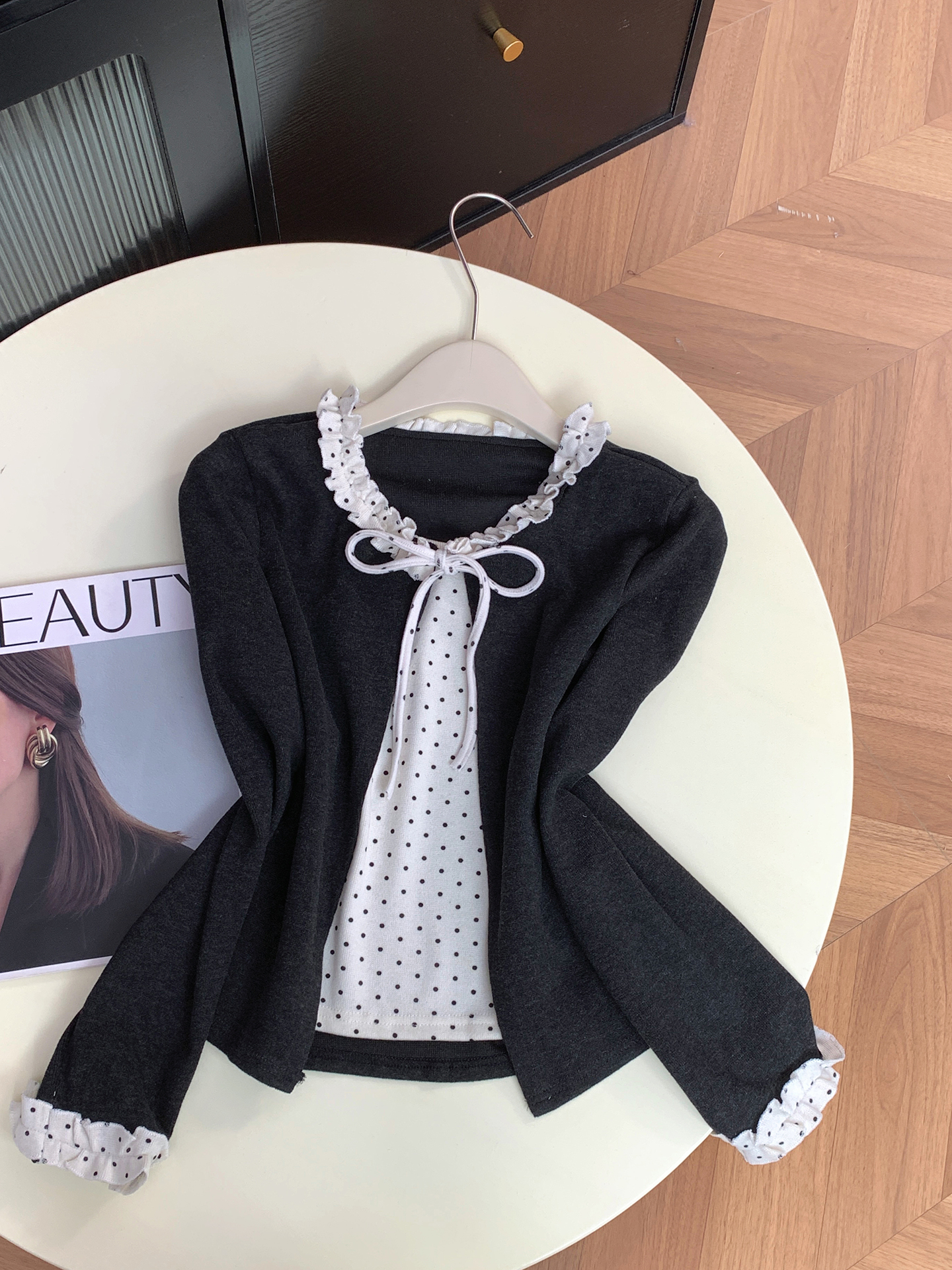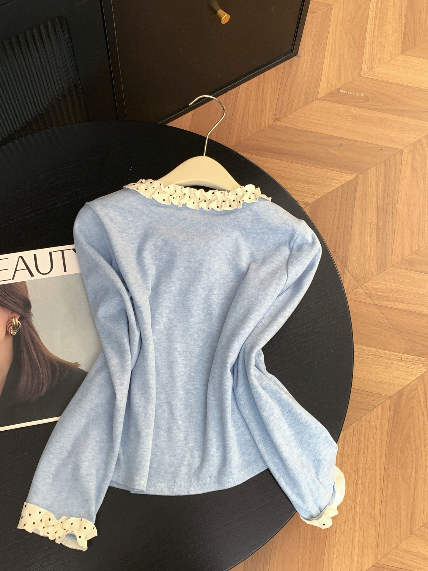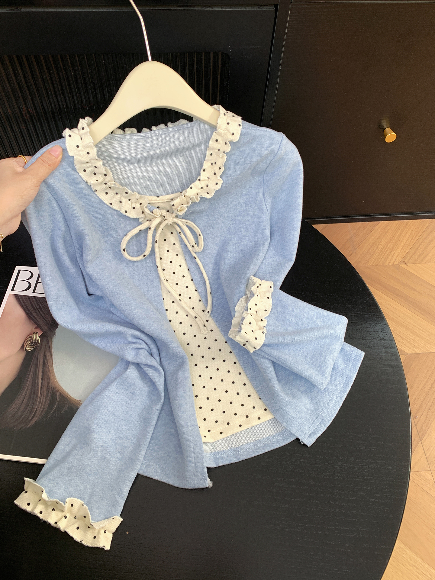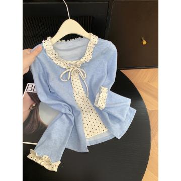 FA56821# 假两件木耳花边长袖T恤女新款波点打底衫外穿上衣 服裝批發女裝批發服飾貨源