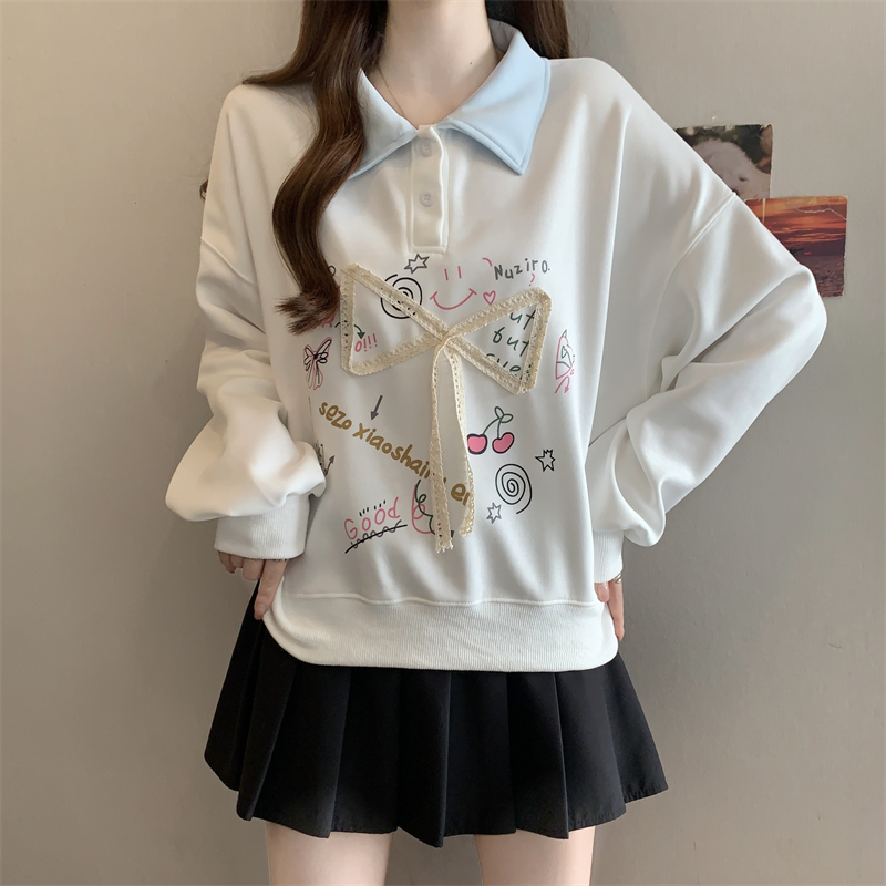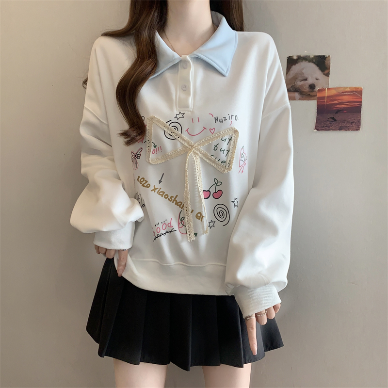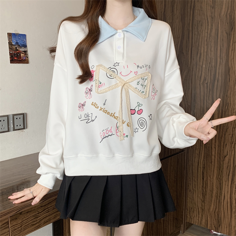 FA56832# 大码胖MM春季新款蝴蝶结印花卫衣女polo领学院风上衣 服裝批發女裝批發服飾貨源