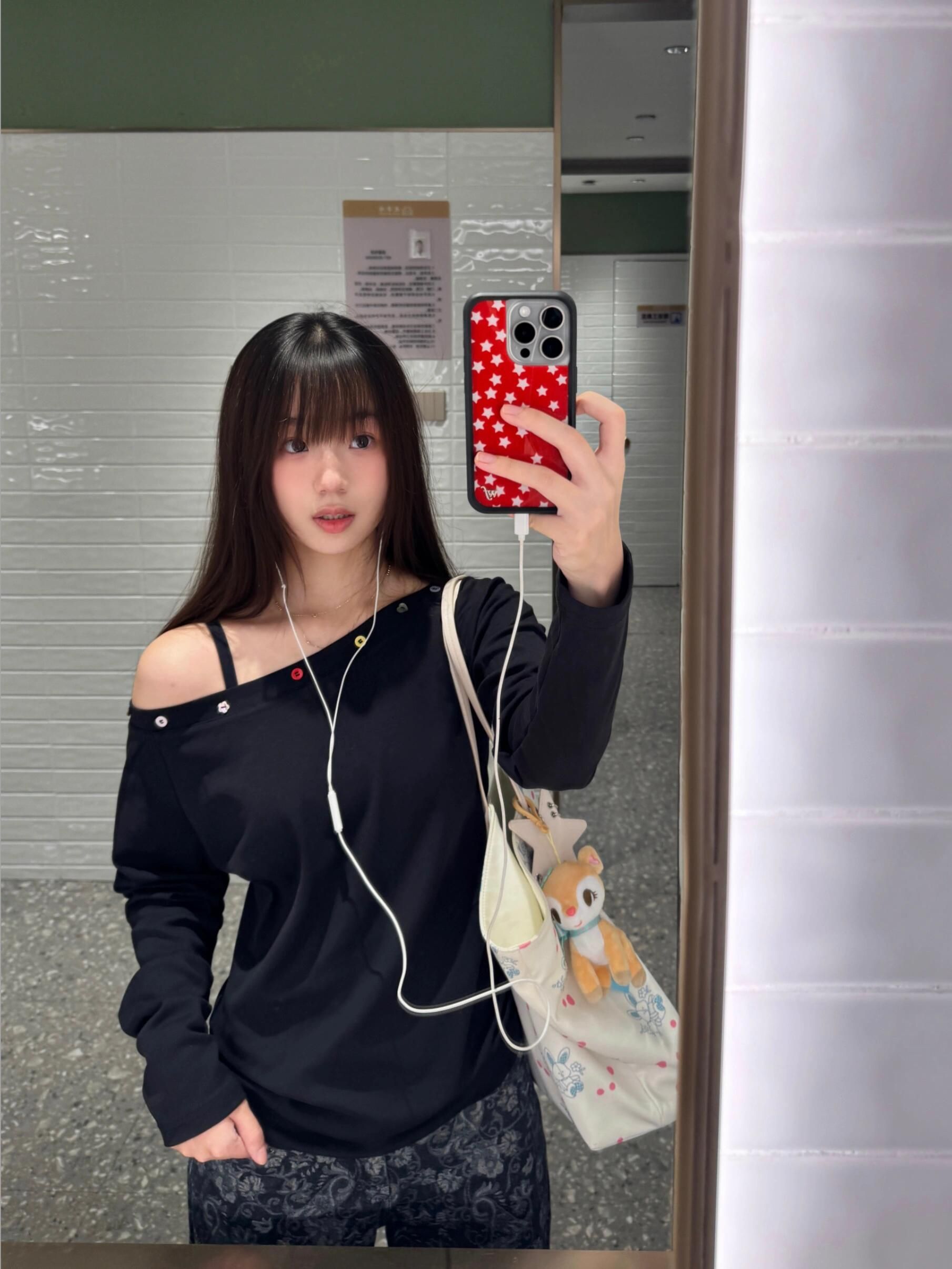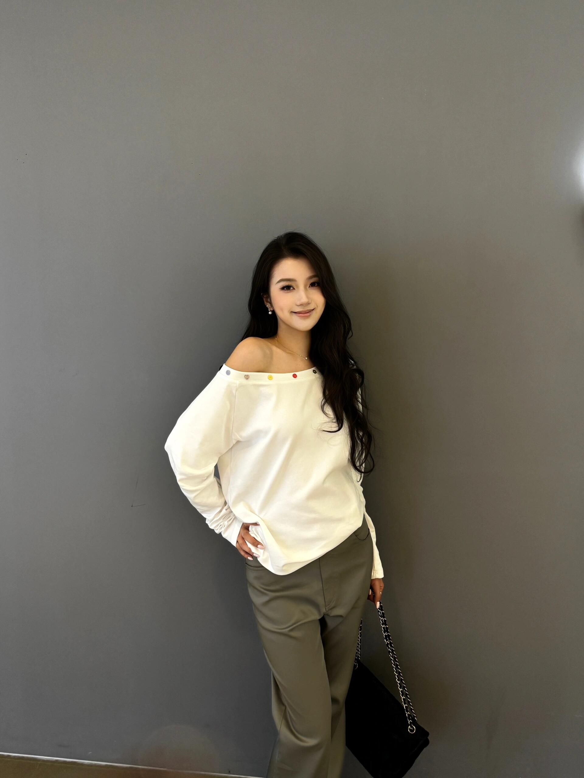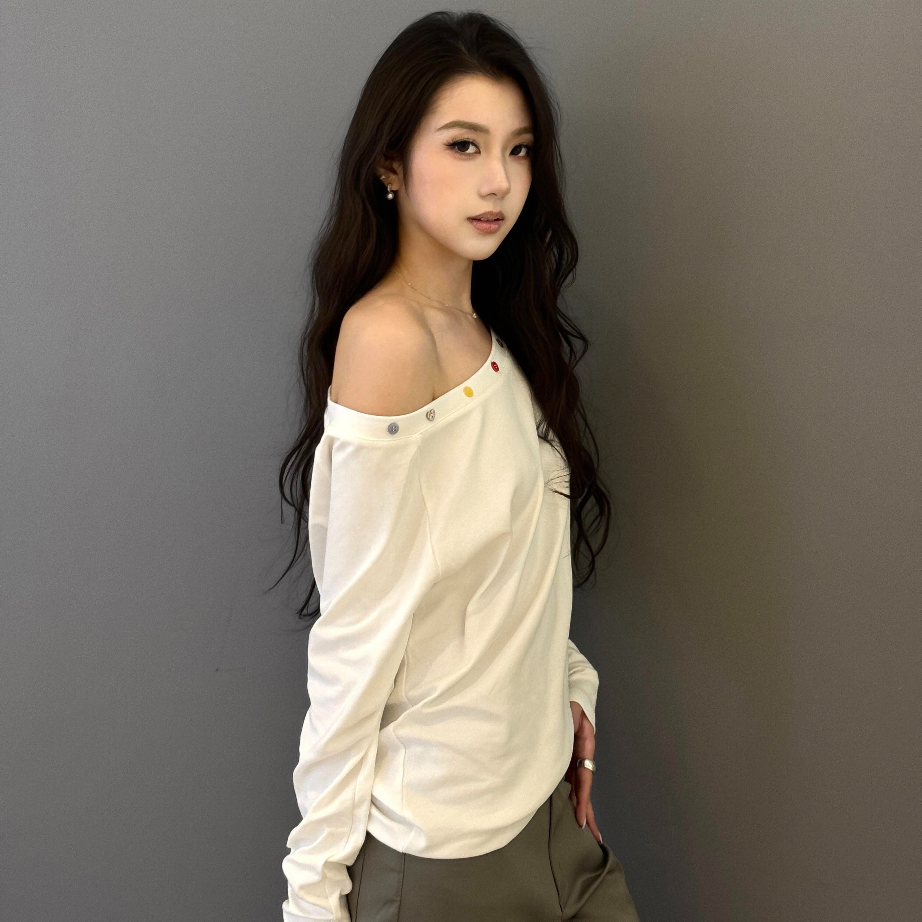 FA56834# 原版纽扣后包领斜肩一字领宽松长袖t恤女 服裝批發女裝批發服飾貨源