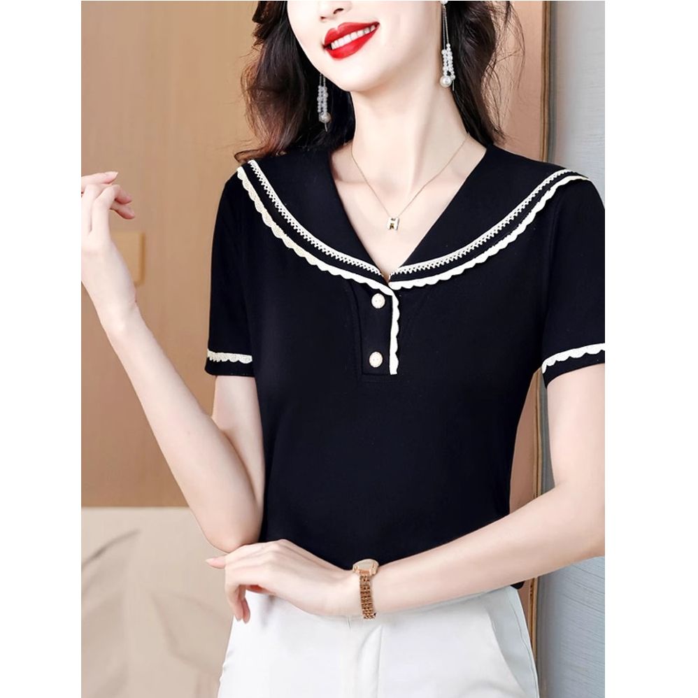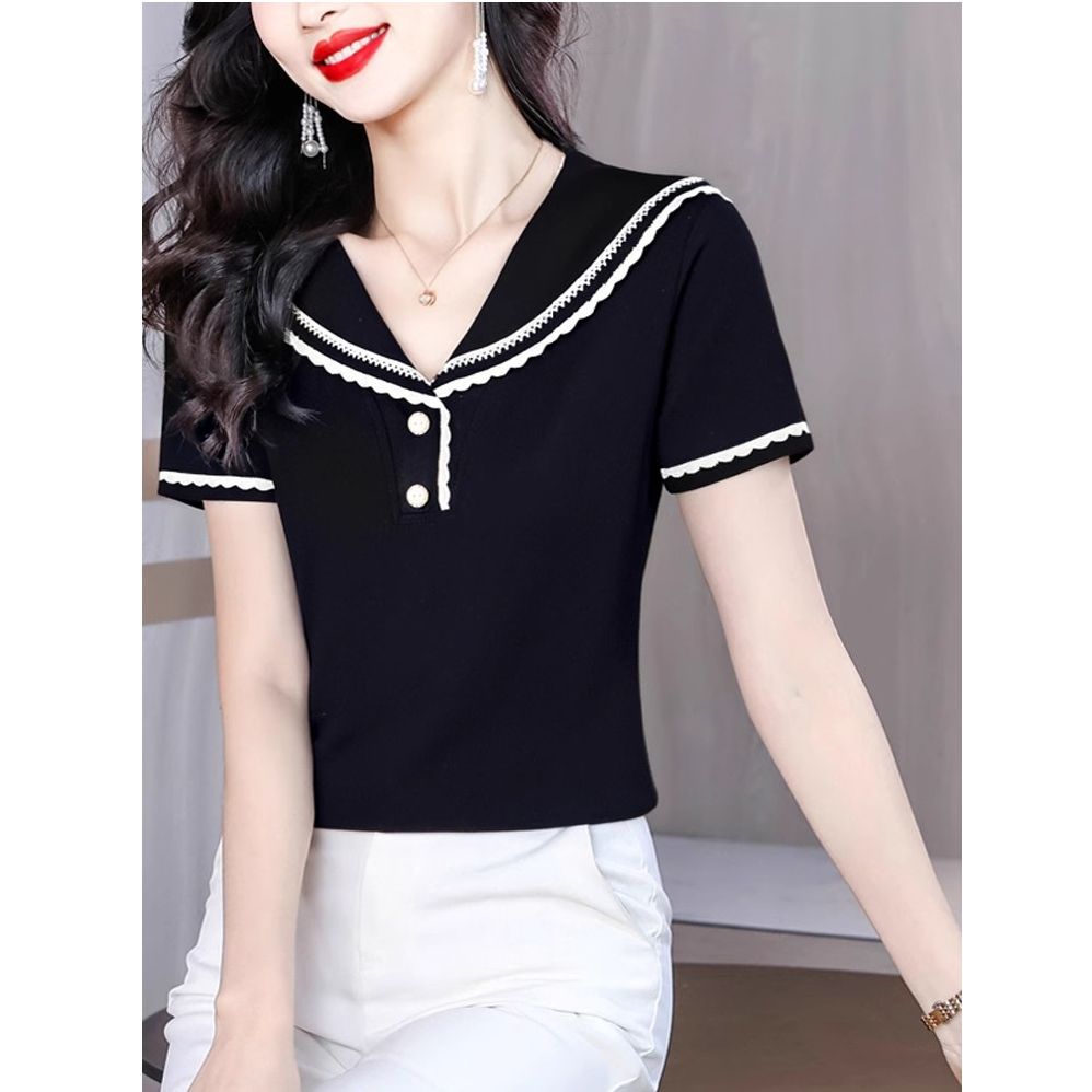 BY10679# 夏季假两件正肩短袖t恤女新上款海军领白色上衣半袖t恤ins 服裝批發女裝批發服飾貨源