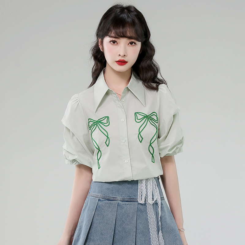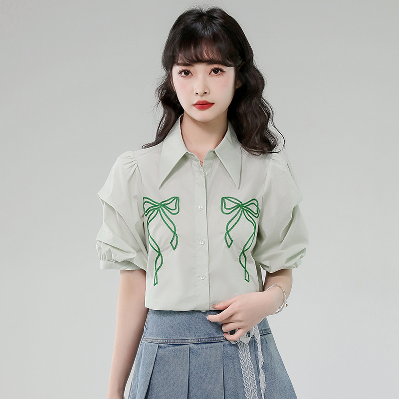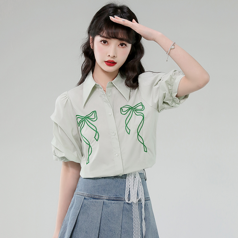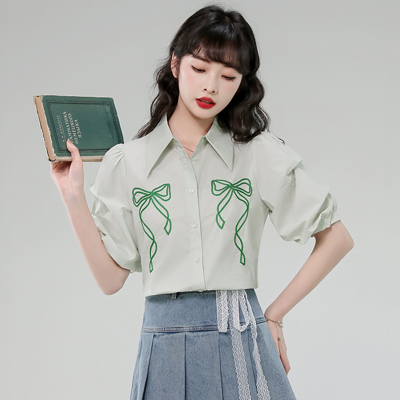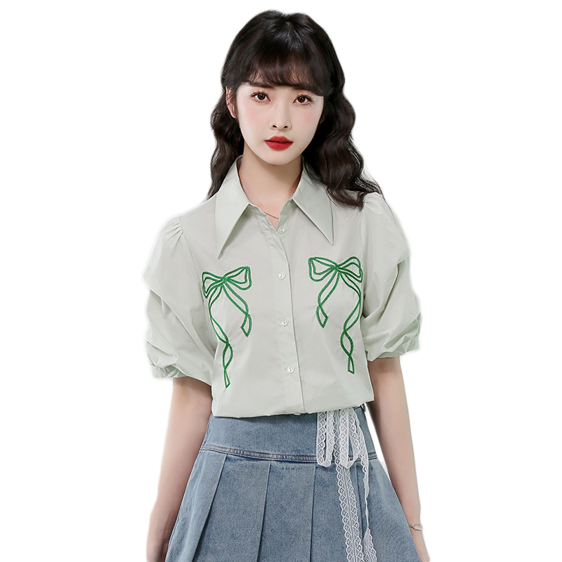 BY12981# 有货法式泡泡袖衬衫夏季新款翻领蝴蝶结绣花透气上衣女 服裝批發女裝批發服飾貨源