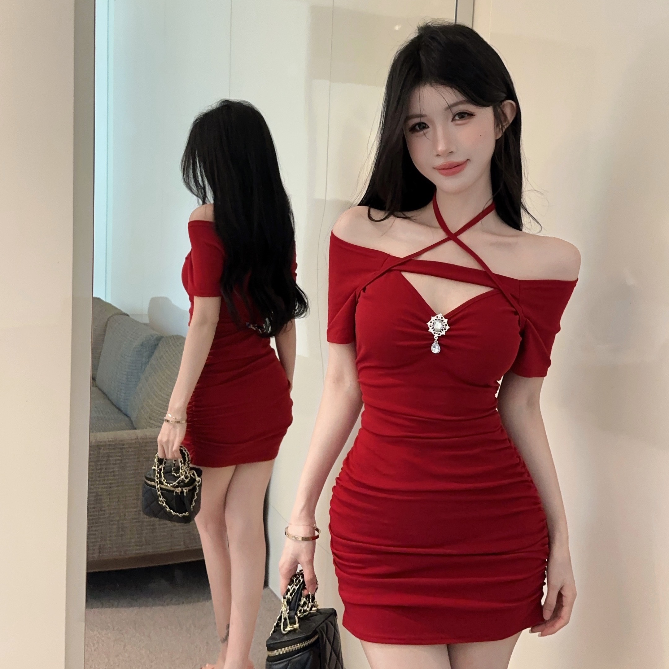 BY13046# 性感一字肩交叉带连衣裙女修身显瘦镶钻晚宴蹦迪紧身短裙子 服裝批發女裝批發服飾貨源