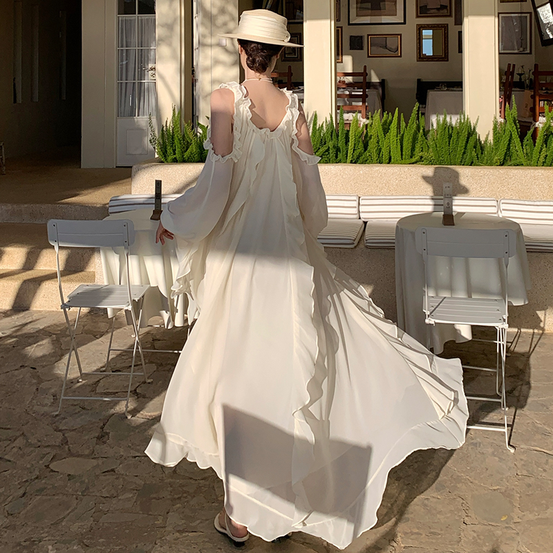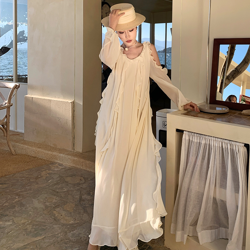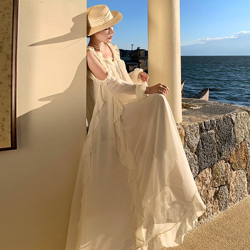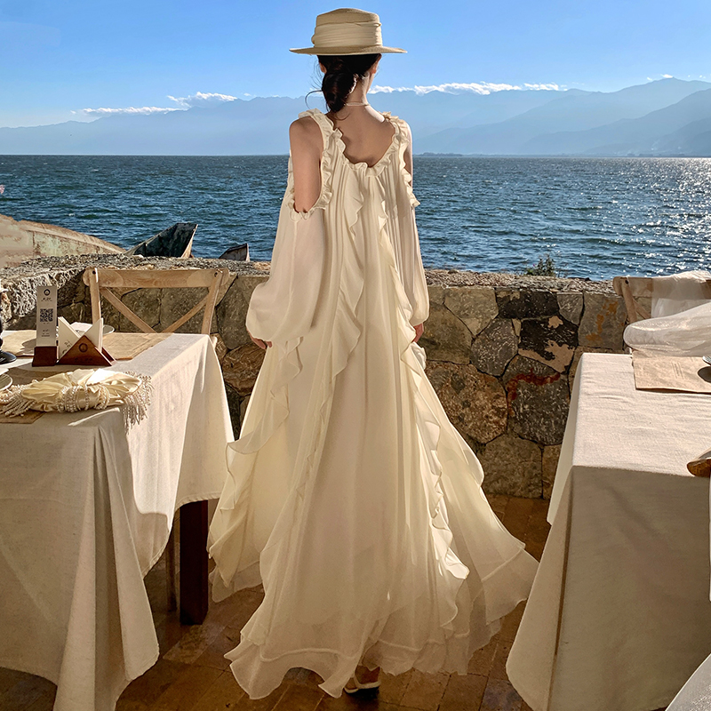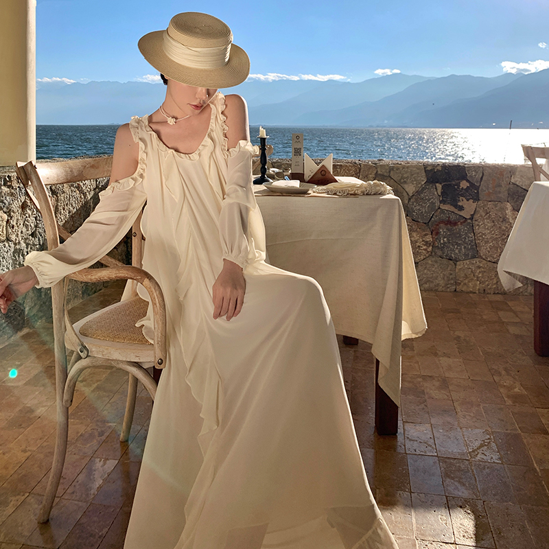BY13068# 法式高级感露肩长袖荷叶边连衣裙宽松显瘦仙女长裙 服裝批發女裝批發服飾貨源