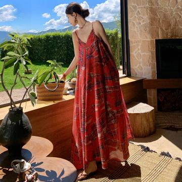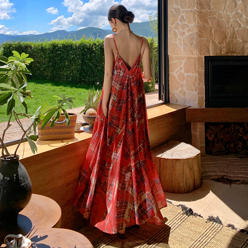 BY13088# 法式复古格纹吊带连衣裙设计感小众不规则下摆辣妹长裙夏 服裝批發女裝批發服飾貨源