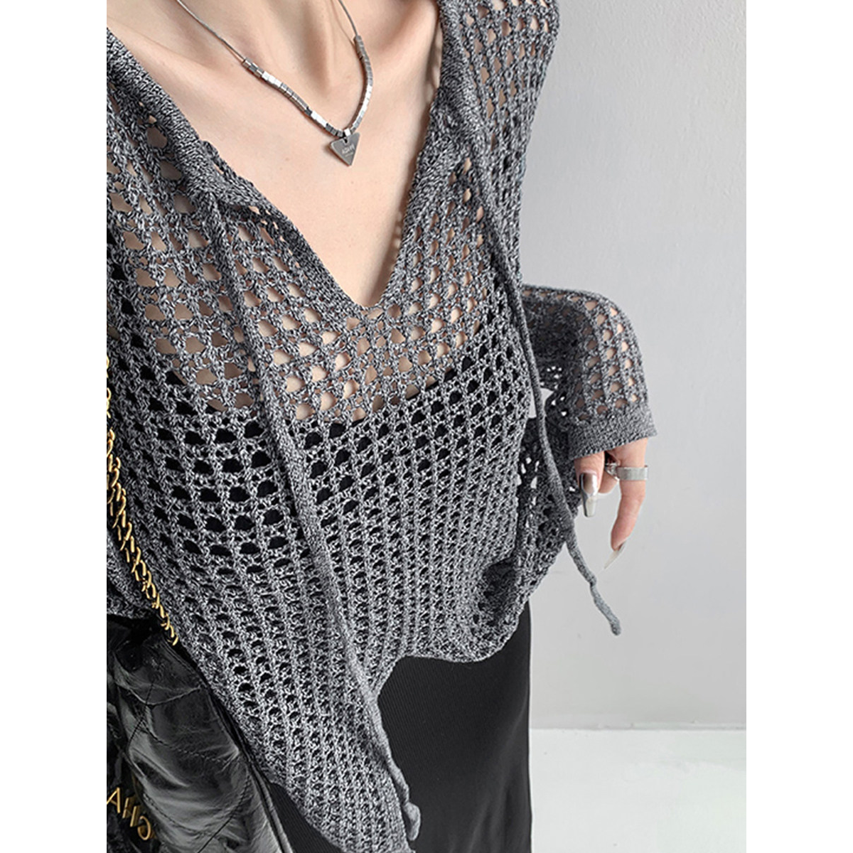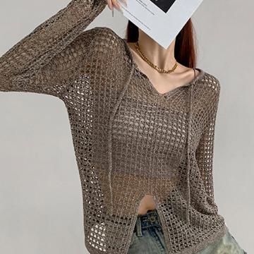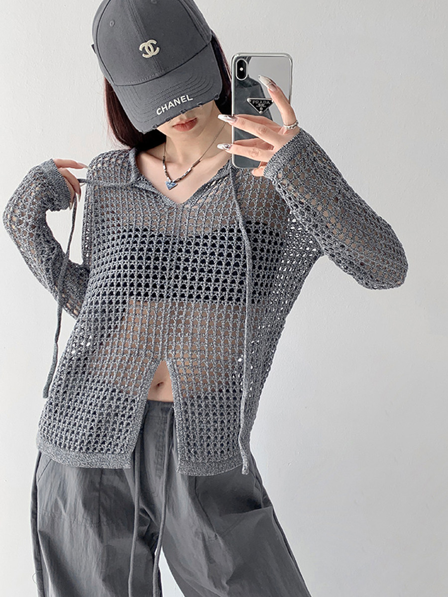 BY13125# 美式透视宽松镂空针织设计感长袖上衣女春夏新款开叉防晒网格罩衫 服裝批發女裝批發服飾貨源