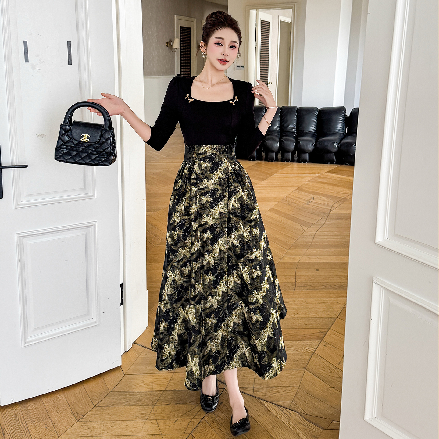 BY13139# 春款大码方领拼接提花设计感复古法式高级显瘦连衣裙 服裝批發女裝批發服飾貨源