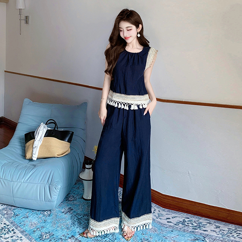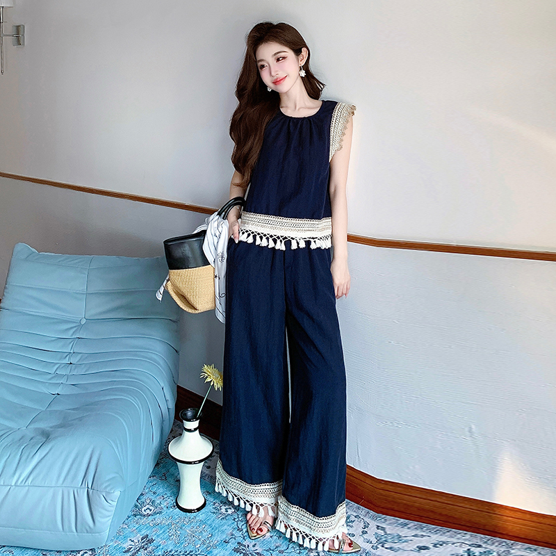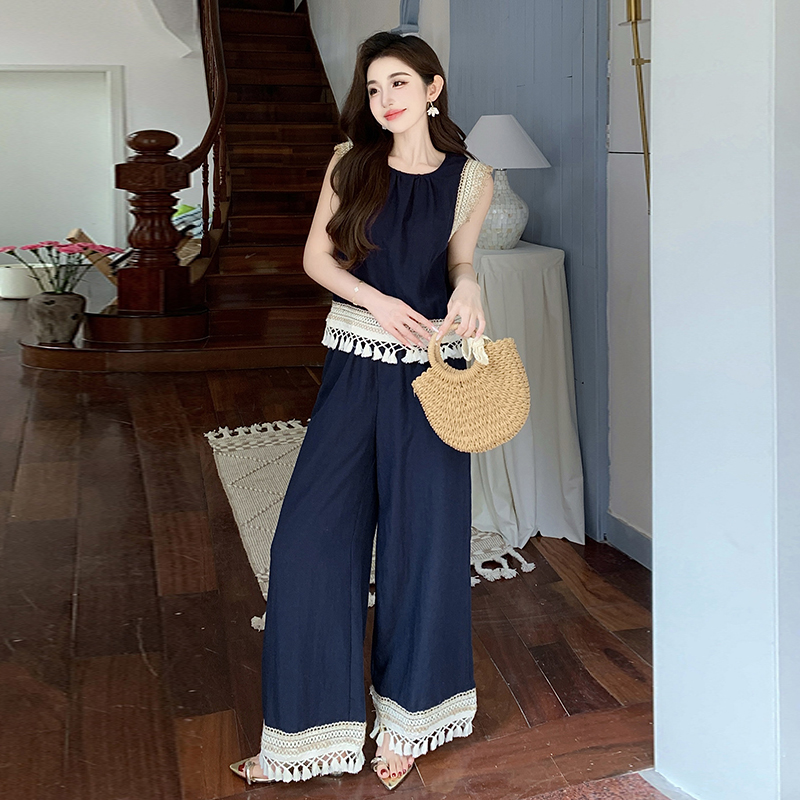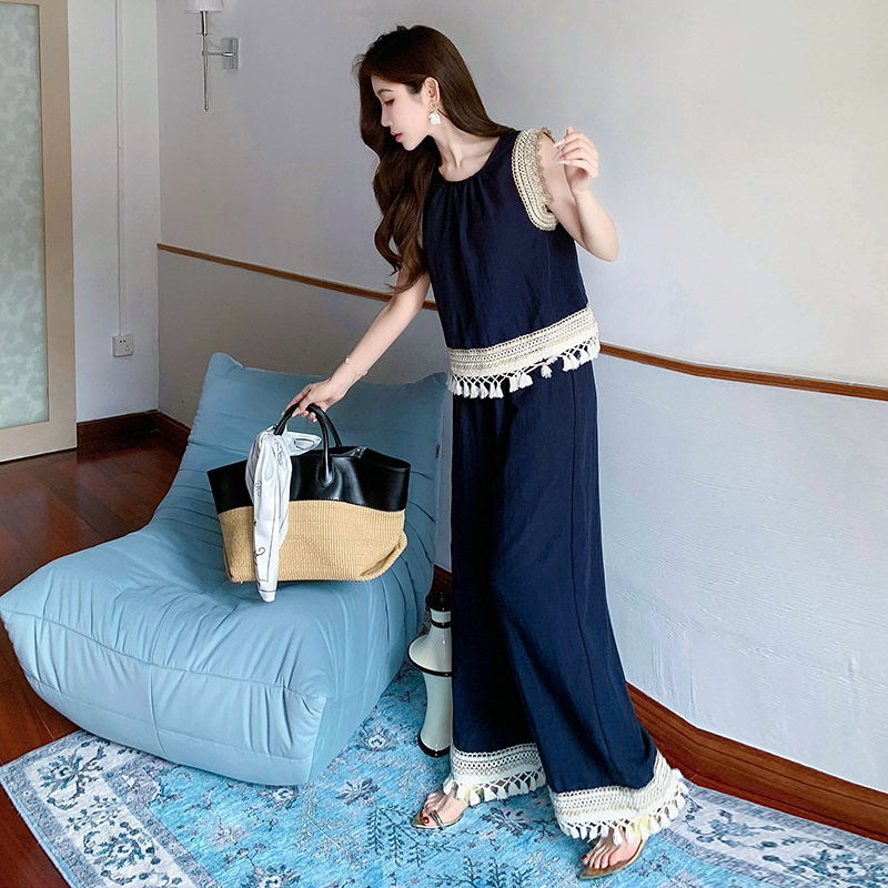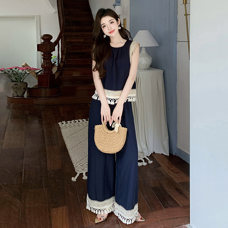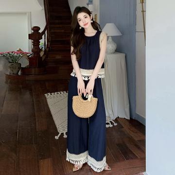 BY13154# 夏波西米亚风流苏拼接天丝牛仔度假风背心阔腿裤两件套 服裝批發女裝批發服飾貨源