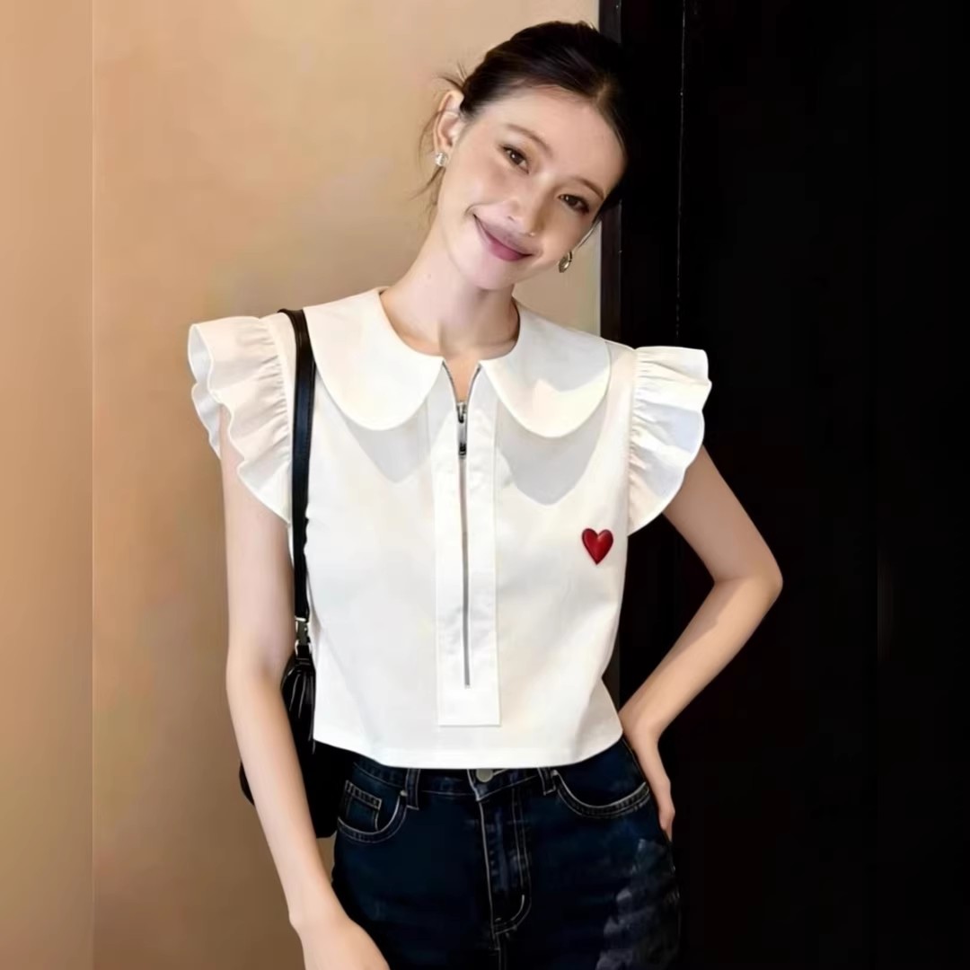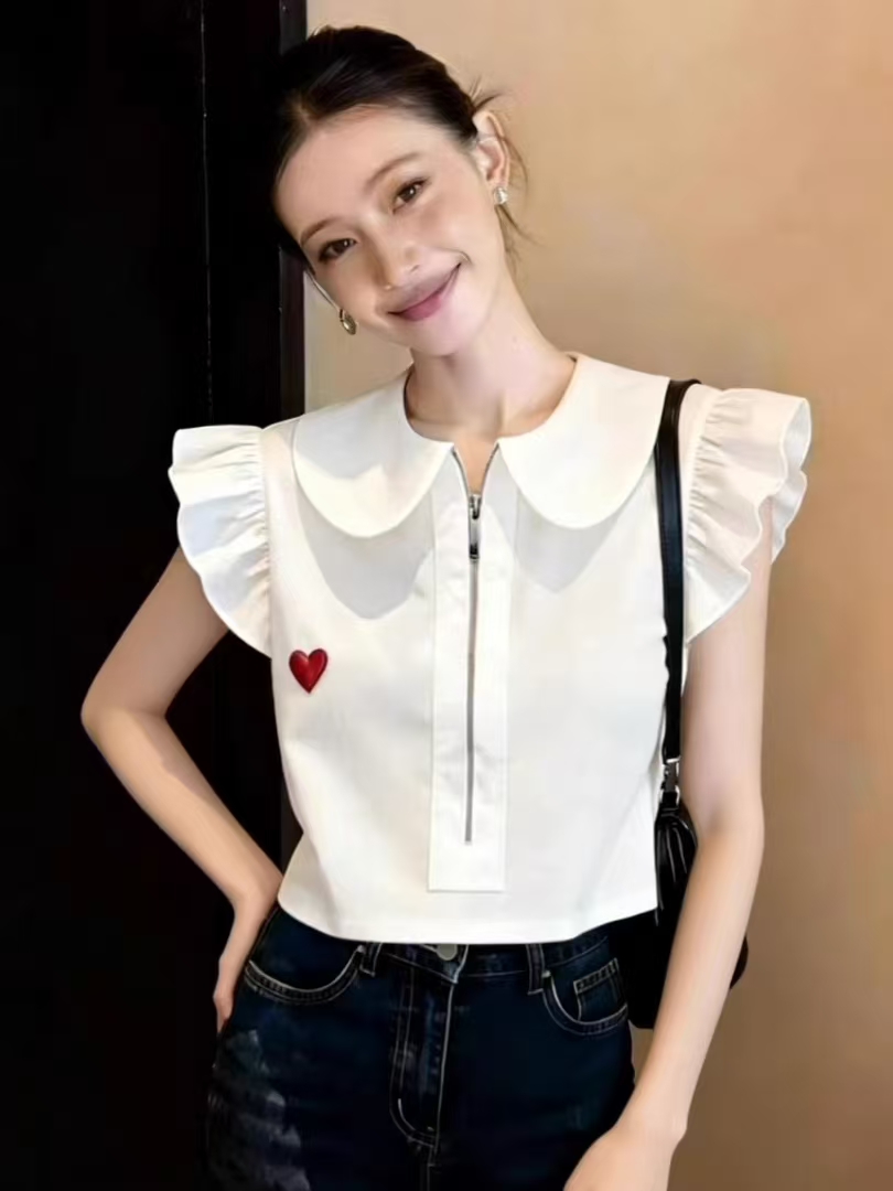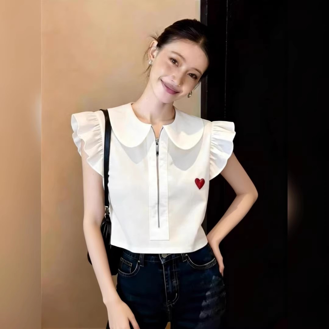 BY13249# 设计感娃娃领爱心刺绣衬衫女春季拉链短款显瘦减龄上衣百搭 服裝批發女裝批發服飾貨源