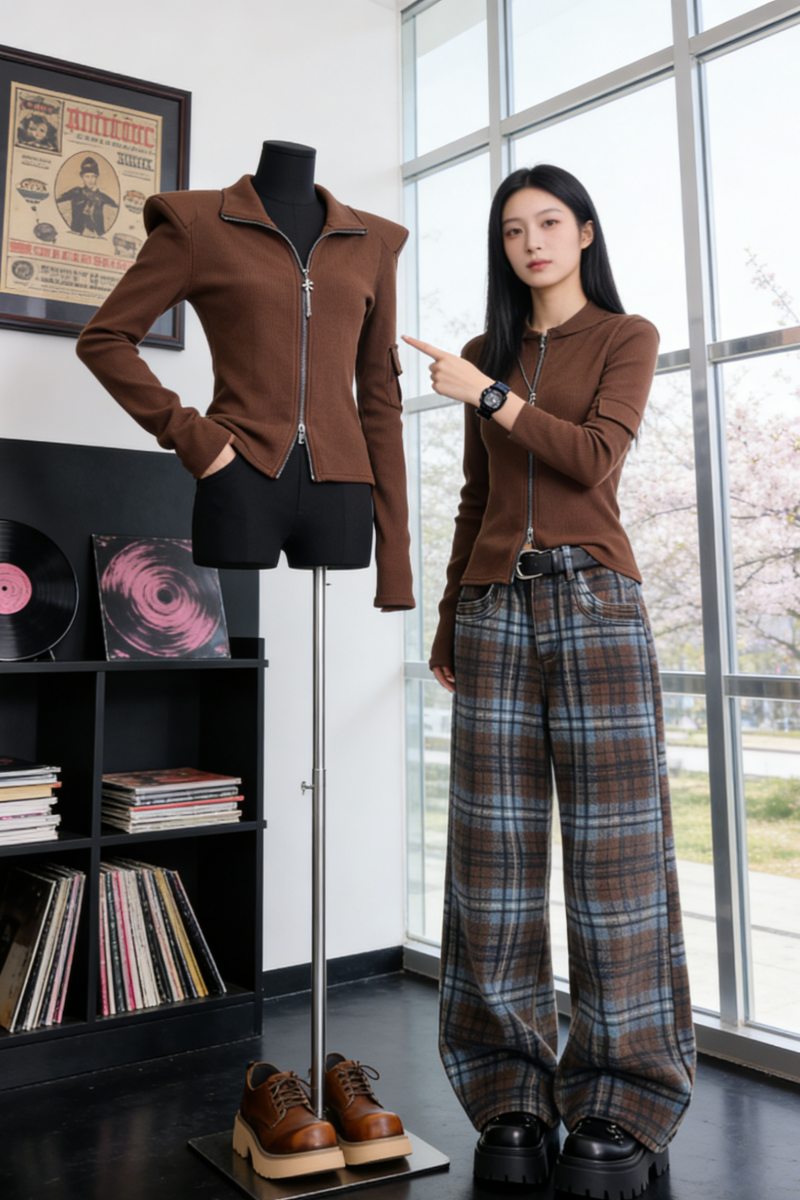 BY13279# 春秋新款蓝色格子牛仔裤女设计感宽松显瘦阔腿裤拖地长裤子 服裝批發女裝批發服飾貨源
