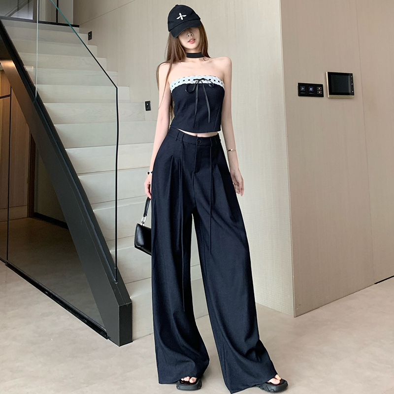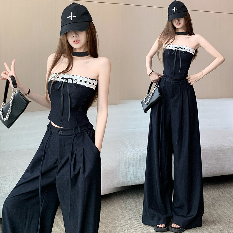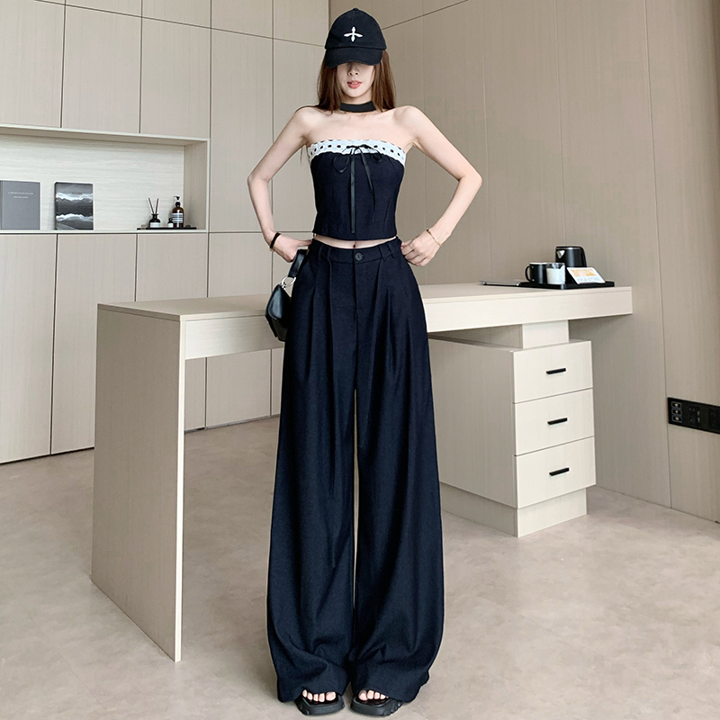BY13280# 纯欲风天丝牛仔性感辣妹抹胸上衣阔腿裤巨好看的套装女春夏两件套 服裝批發女裝批發服飾貨源