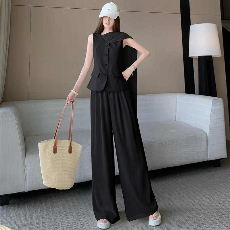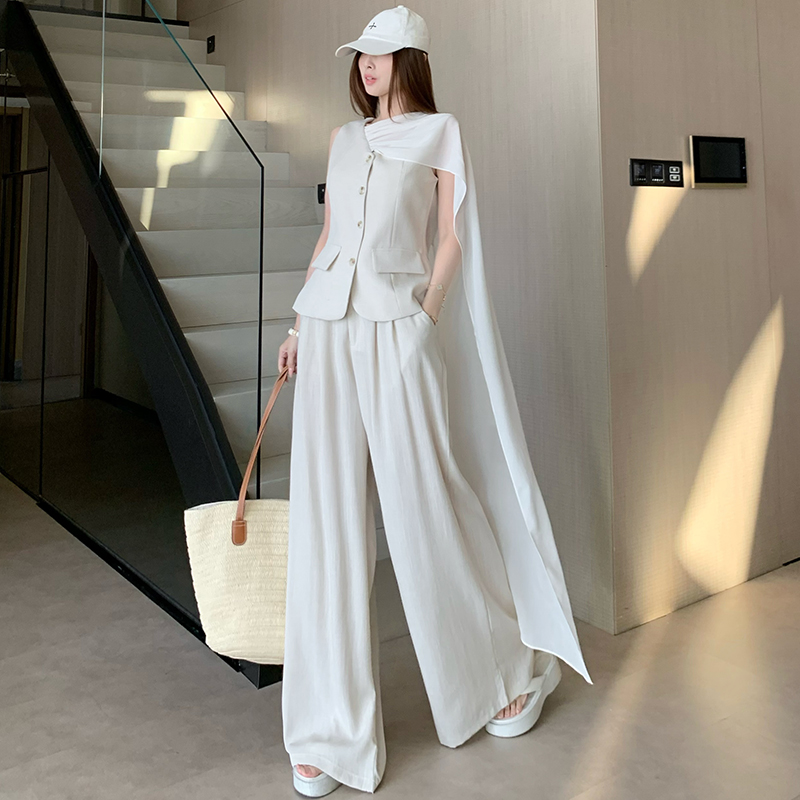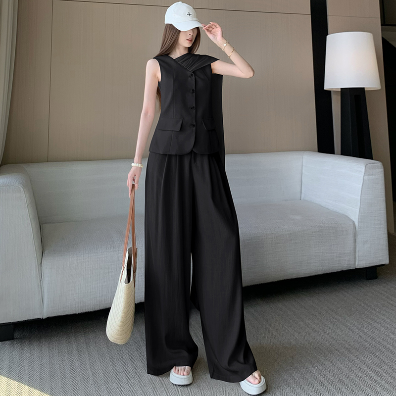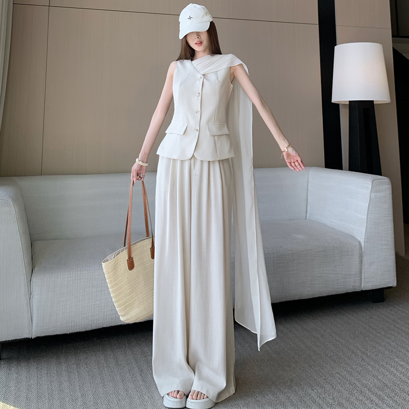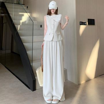 BY13285# 飘带丝巾老钱风马甲+高腰阔腿裤套装女春夏新款高级感洋气两件套 服裝批發女裝批發服飾貨源
