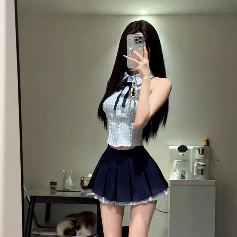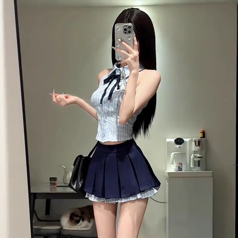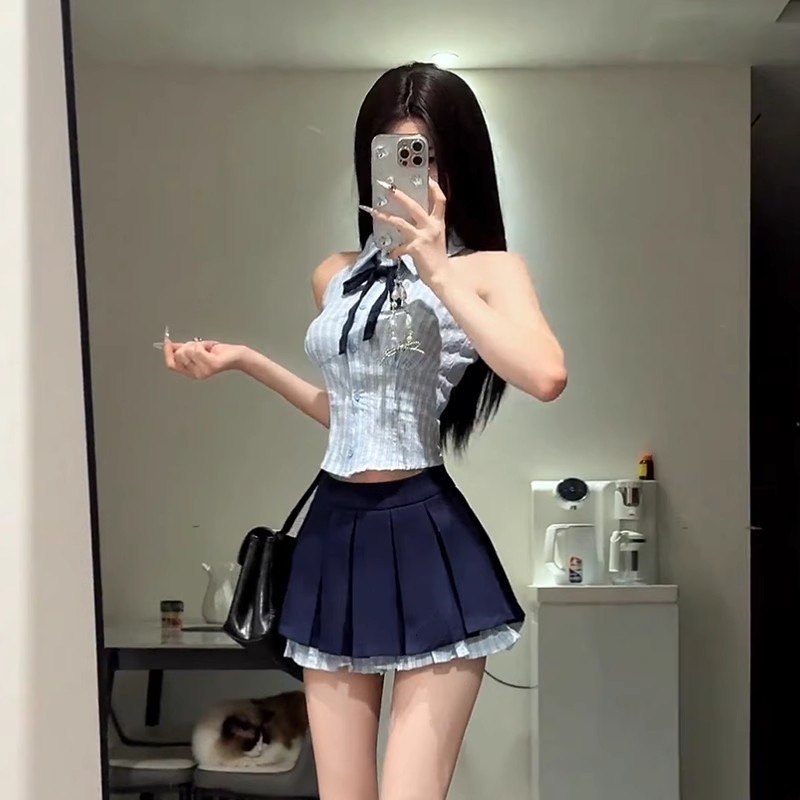 BY13294# 韩系学院风套装女夏季别致辣妹挂脖背心上衣高腰百褶半身裙两件套 服裝批發女裝批發服飾貨源