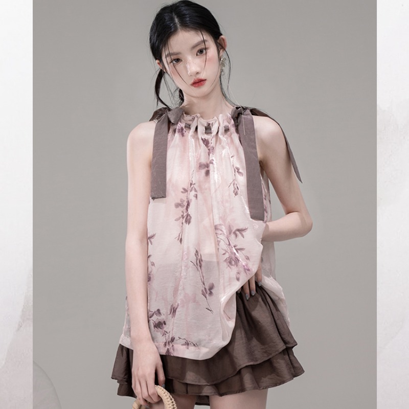 BY13400# OTRE赤茶玫瑰挖肩抽褶飘带上衣+半身裙套装 服裝批發女裝批發服飾貨源
