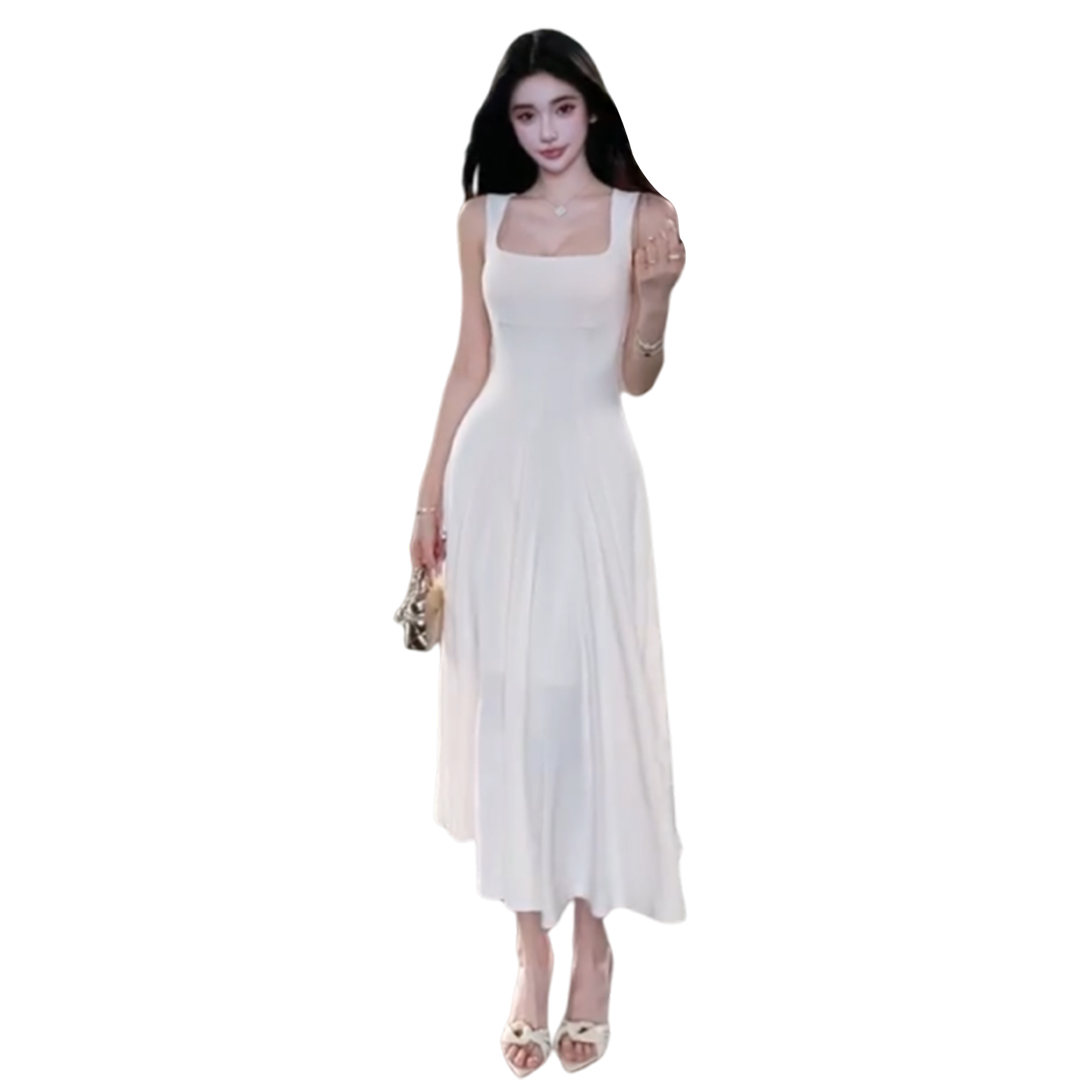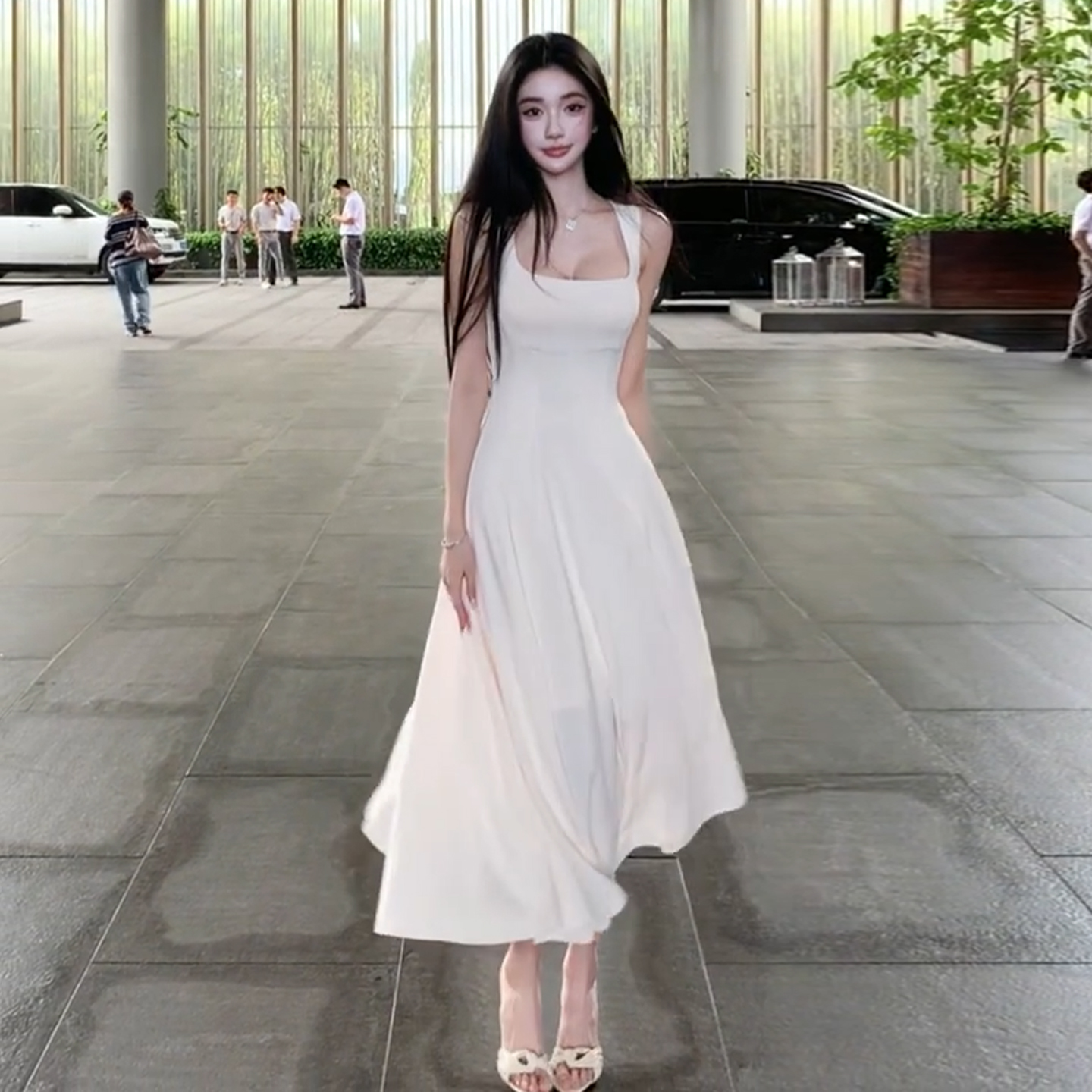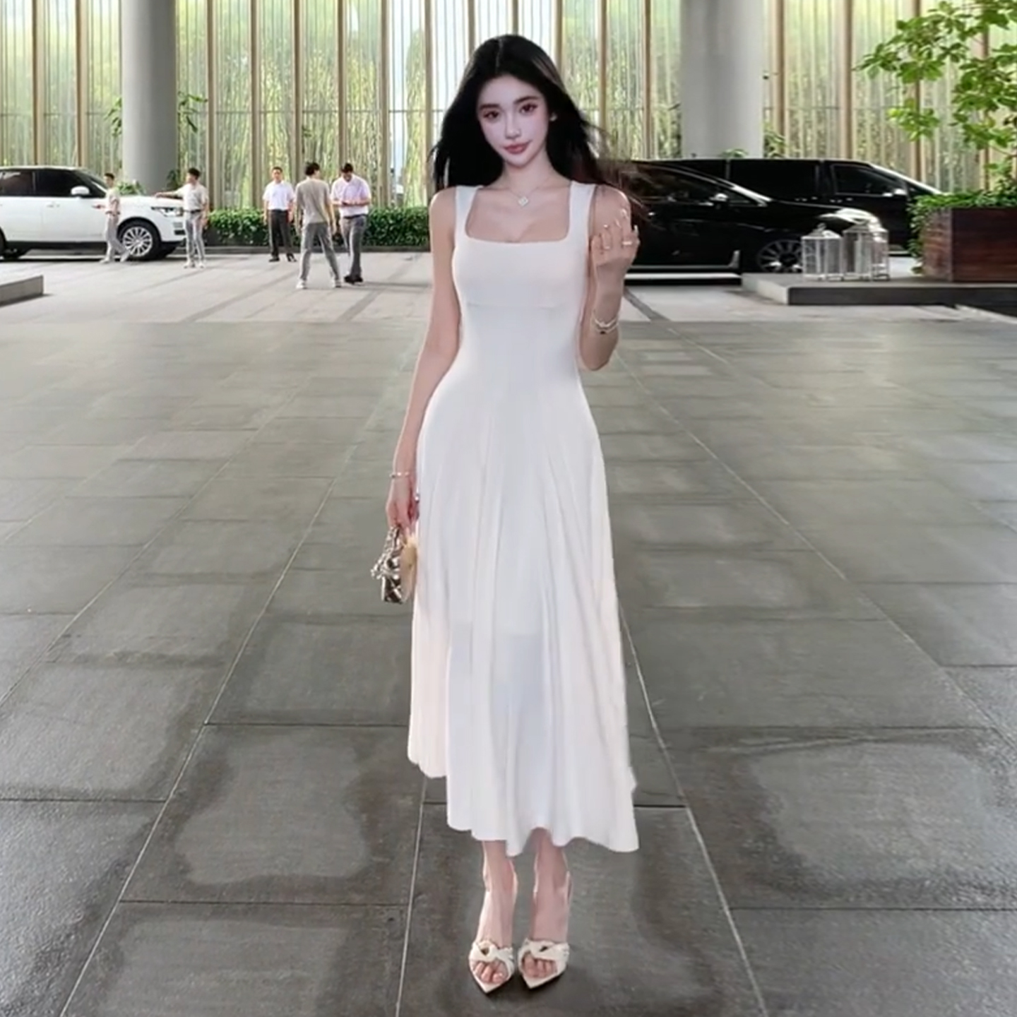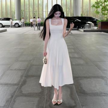 BY13726# 法式高级感白色方领吊带连衣裙子女夏季新款气质收腰显瘦长裙 服裝批發女裝批發服飾貨源