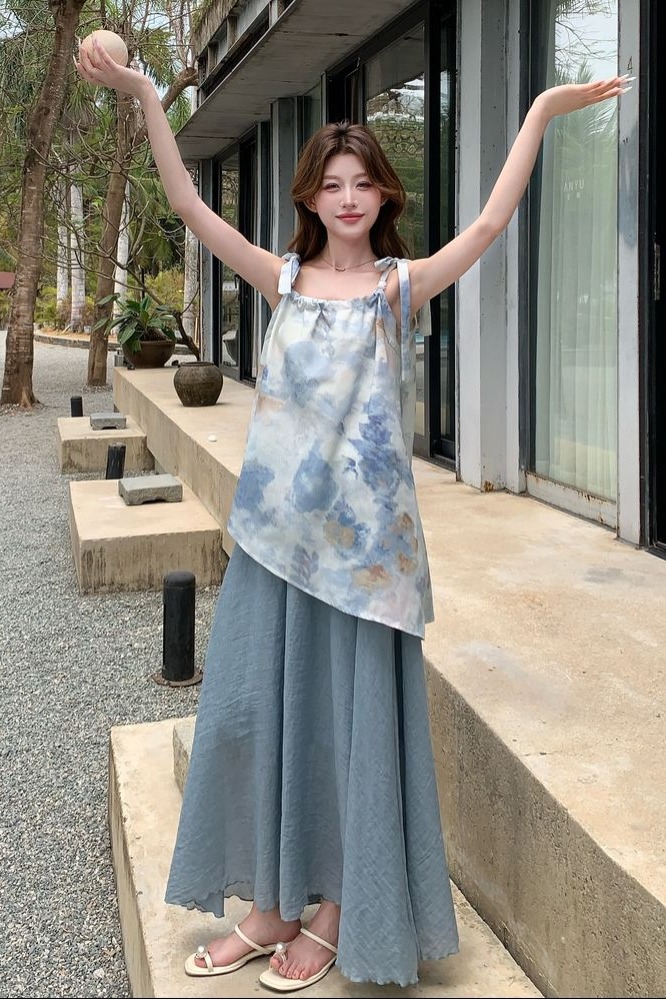 BY13787# 蓝色水墨晕染吊带背心半身裙套装新款夏日绝美海边度假两件套 服裝批發女裝批發服飾貨源