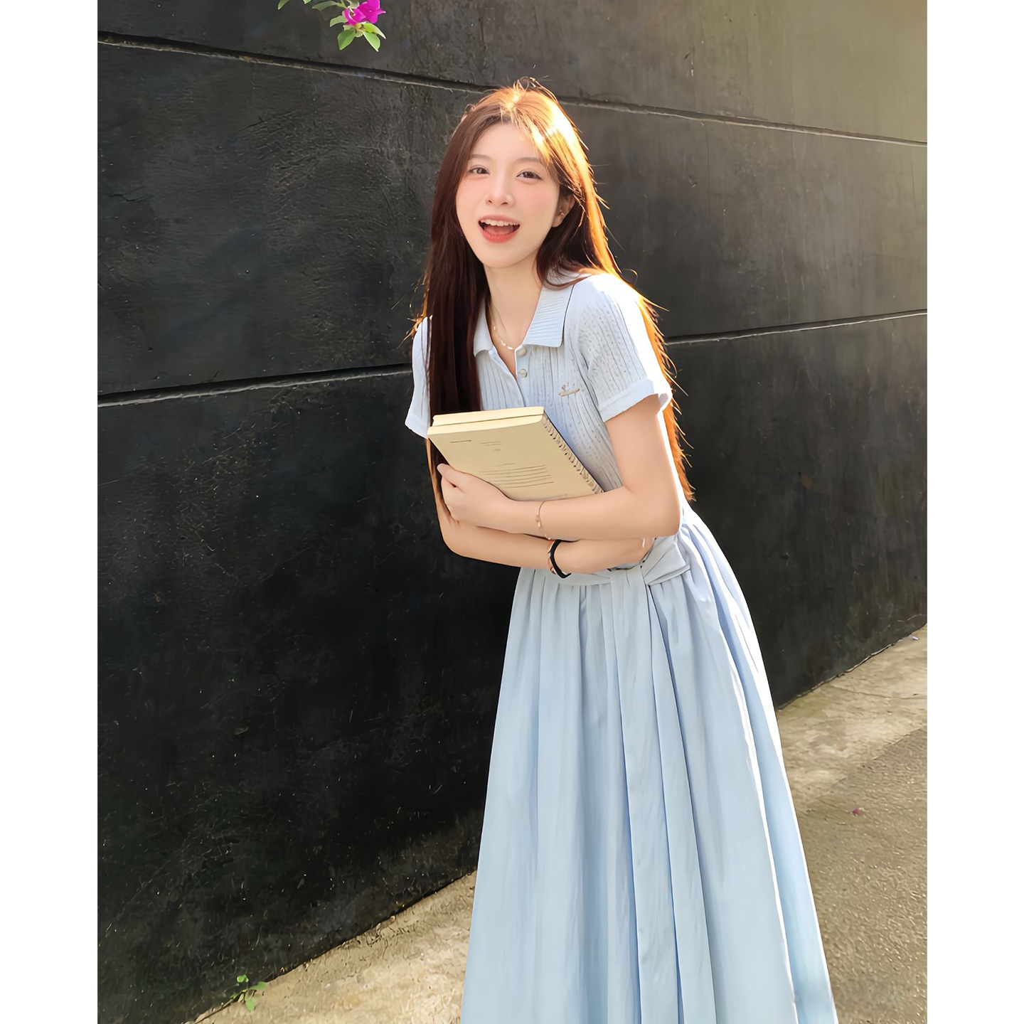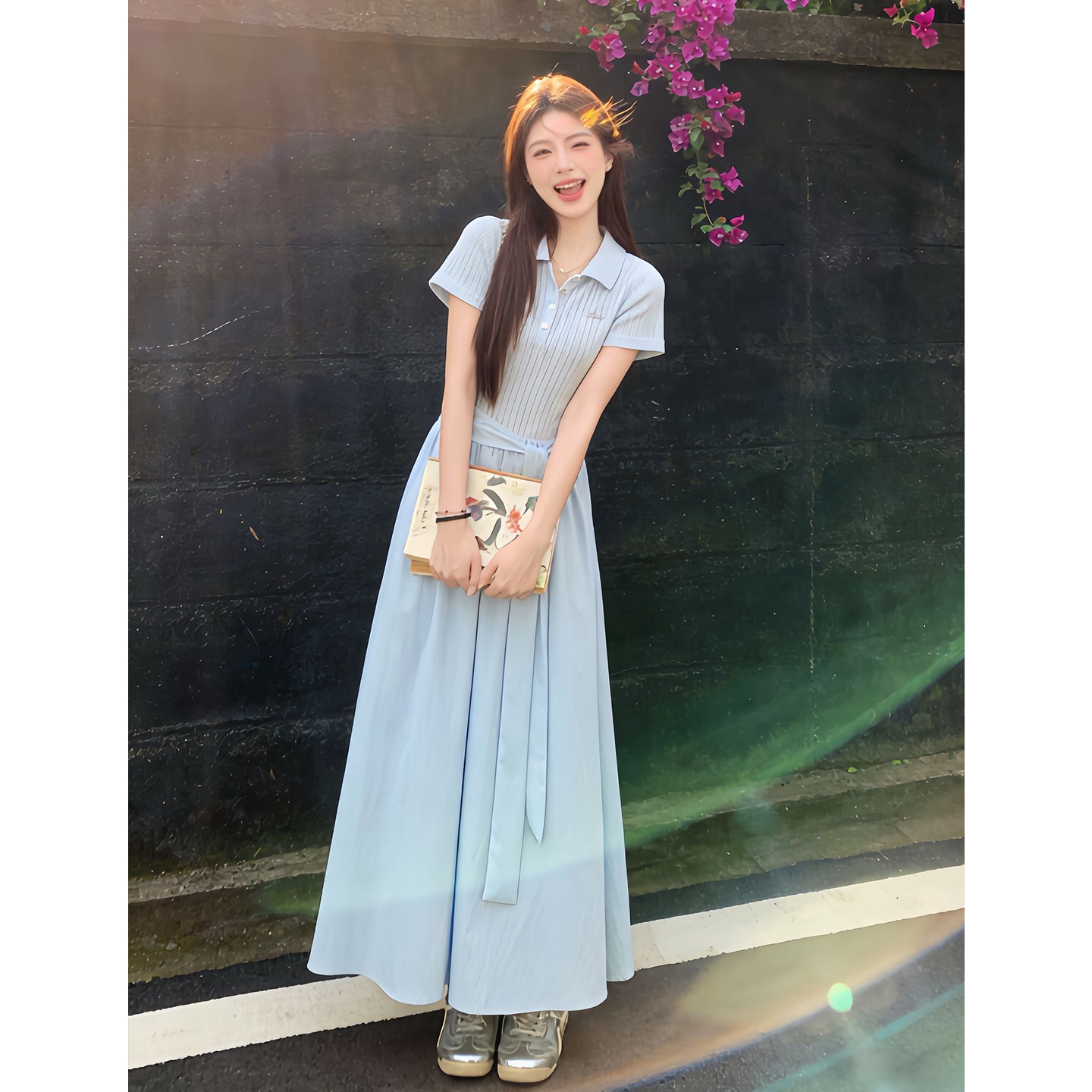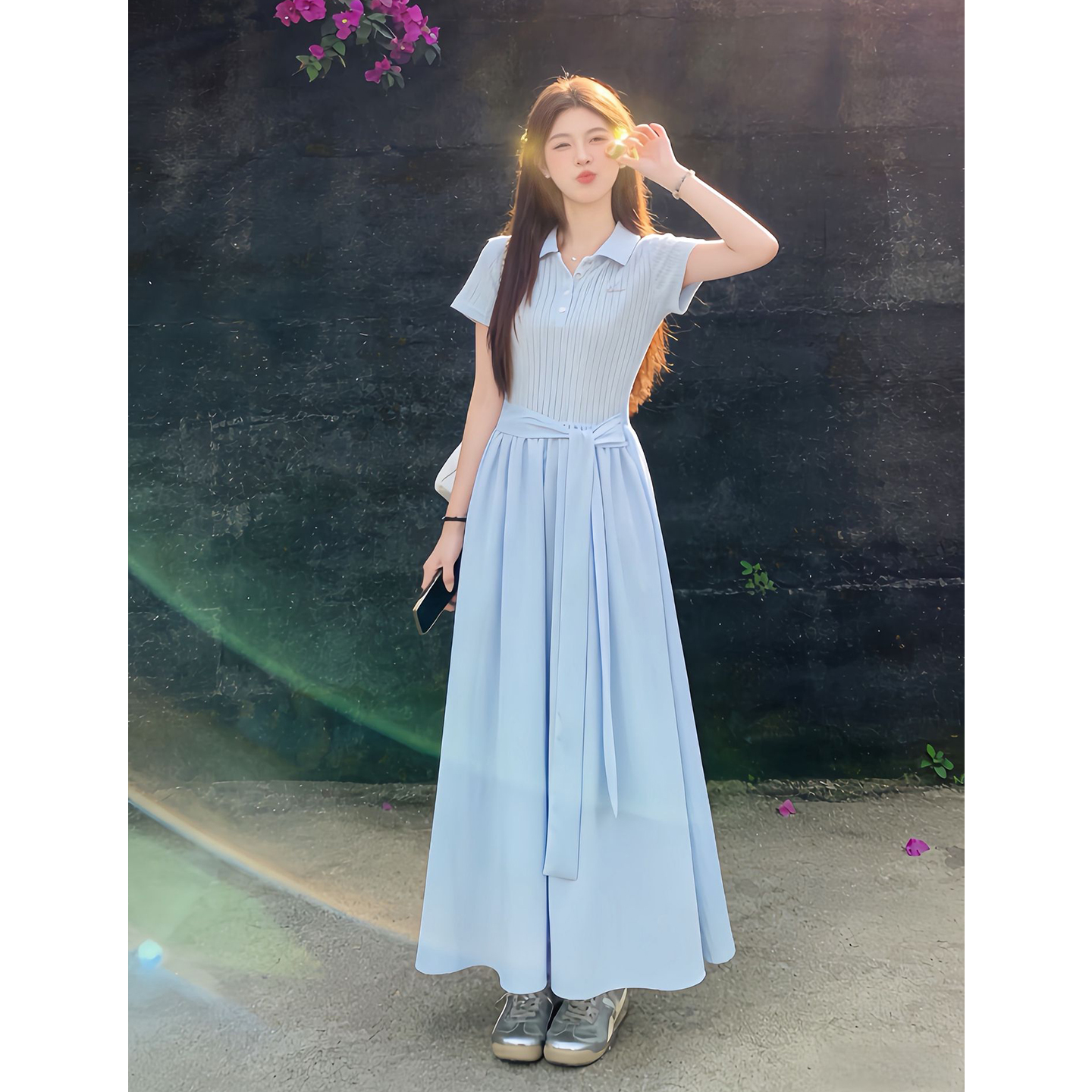 BY13789# 法式蓝色polo领连衣裙子女夏季新款小个子巨好看气质收腰长裙 服裝批發女裝批發服飾貨源